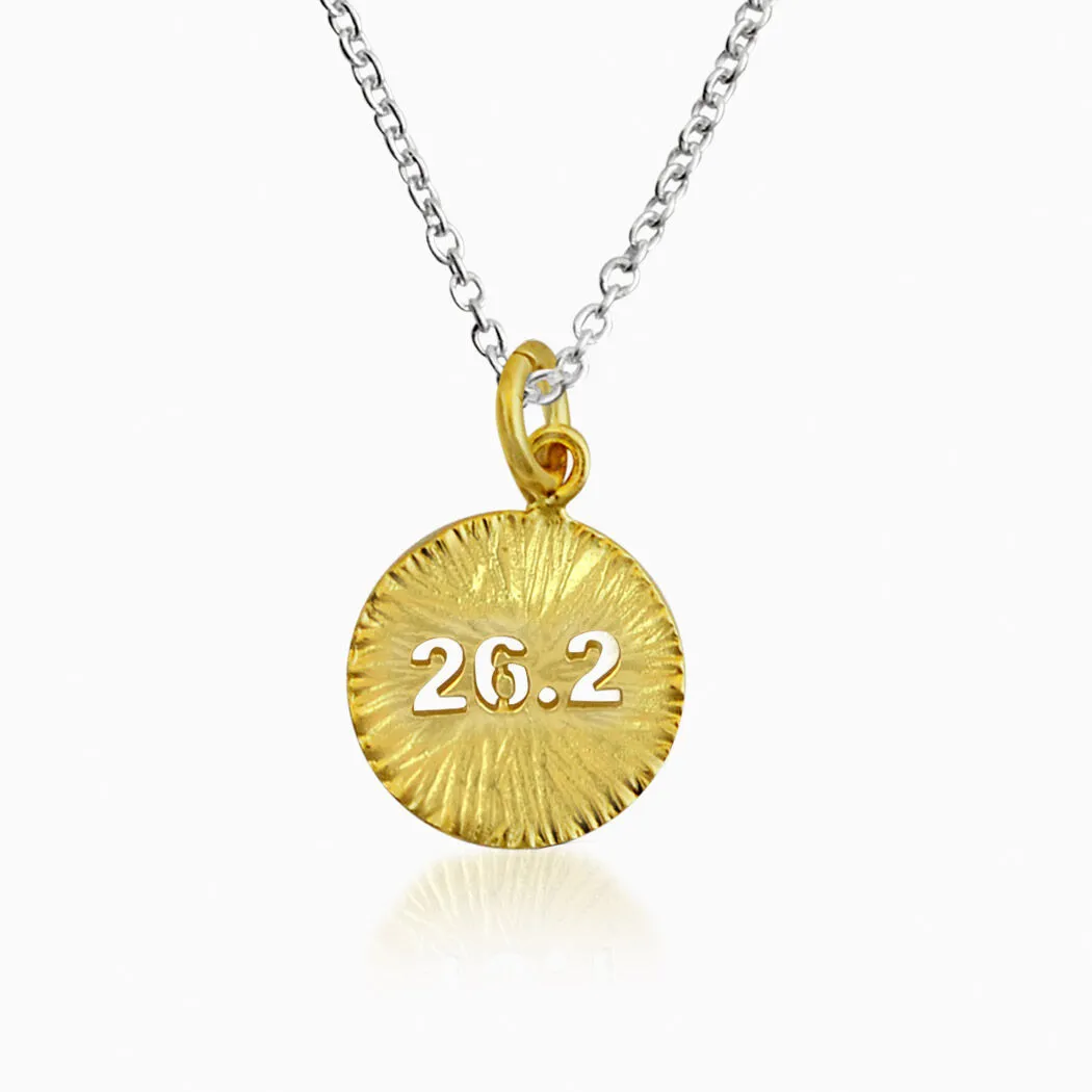Our gold-plated marathon 26.2 necklace is a stylish keepsake for anyone who has completed the marathon and wants to show off their achievement with pride. The hand-crafted, textured gold disc pairs perfectly with the sterling silver necklace. Wear as a single pendant or add additional charms for a layered effect.