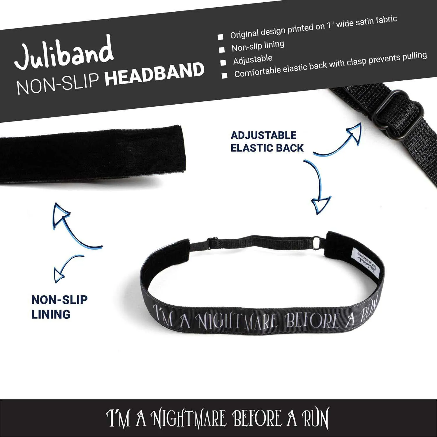 Our comfortable Juliband headband is backed with a non-slip velvet to ensure your hair stays put through any activity. The headband is fully adjustable for the best custom fit. This stylish and unique headband is perfect for a special race, daily runs, or even everyday wear. Our headband is an ideal headband for runners – and an accessory they will not want to be without.