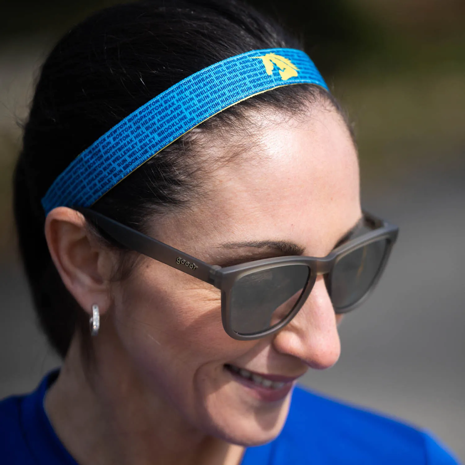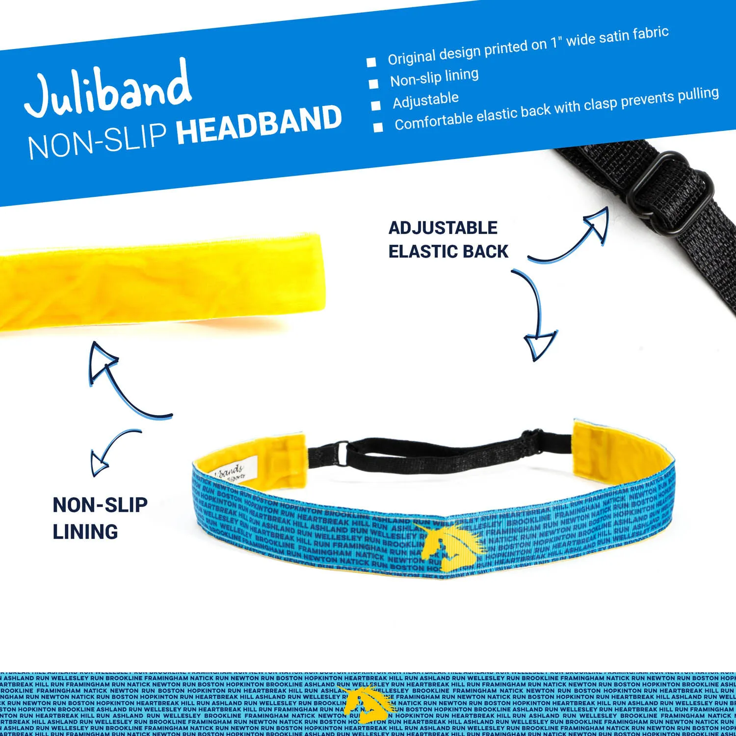 Show off your Boston pride in this eye-catching and adjustable non-slip running headband. Our comfortable Juliband headband is backed with a non-slip velvet to ensure your hair stays put through any activity. The headband is fully adjustable for the best custom fit. The stylish Run Boston headband is an ideal accessory for all the Boston runners and marathoners.