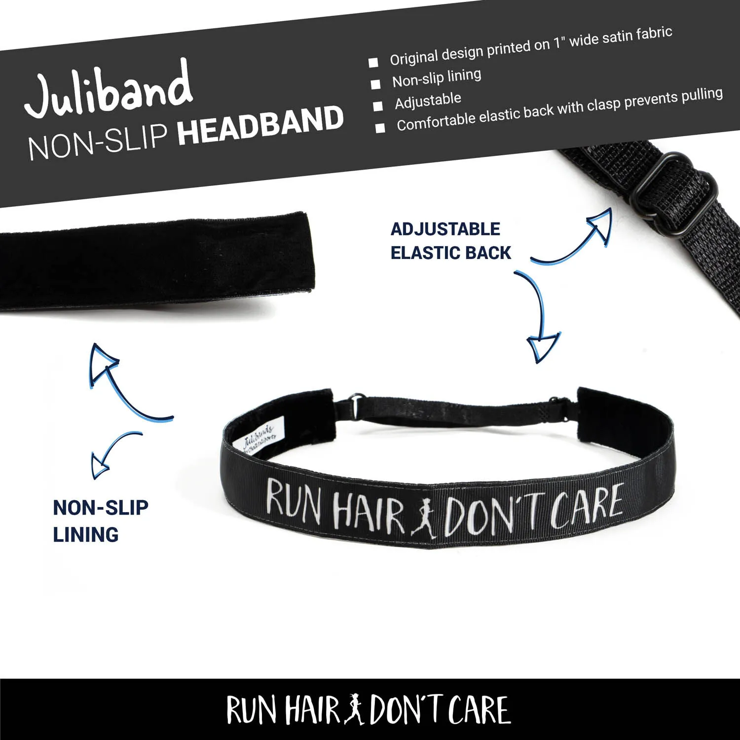 Run Hair, Don’t Care – who can relate? Add a fun touch to your run with this eye-catching and adjustable non-slip running headband. Our comfortable Juliband headband is backed with a non-slip velvet to ensure your hair stays put through any activity. The headband is fully adjustable for the best custom fit. The stylish headband is an ideal accessory to add to any running outfit.
