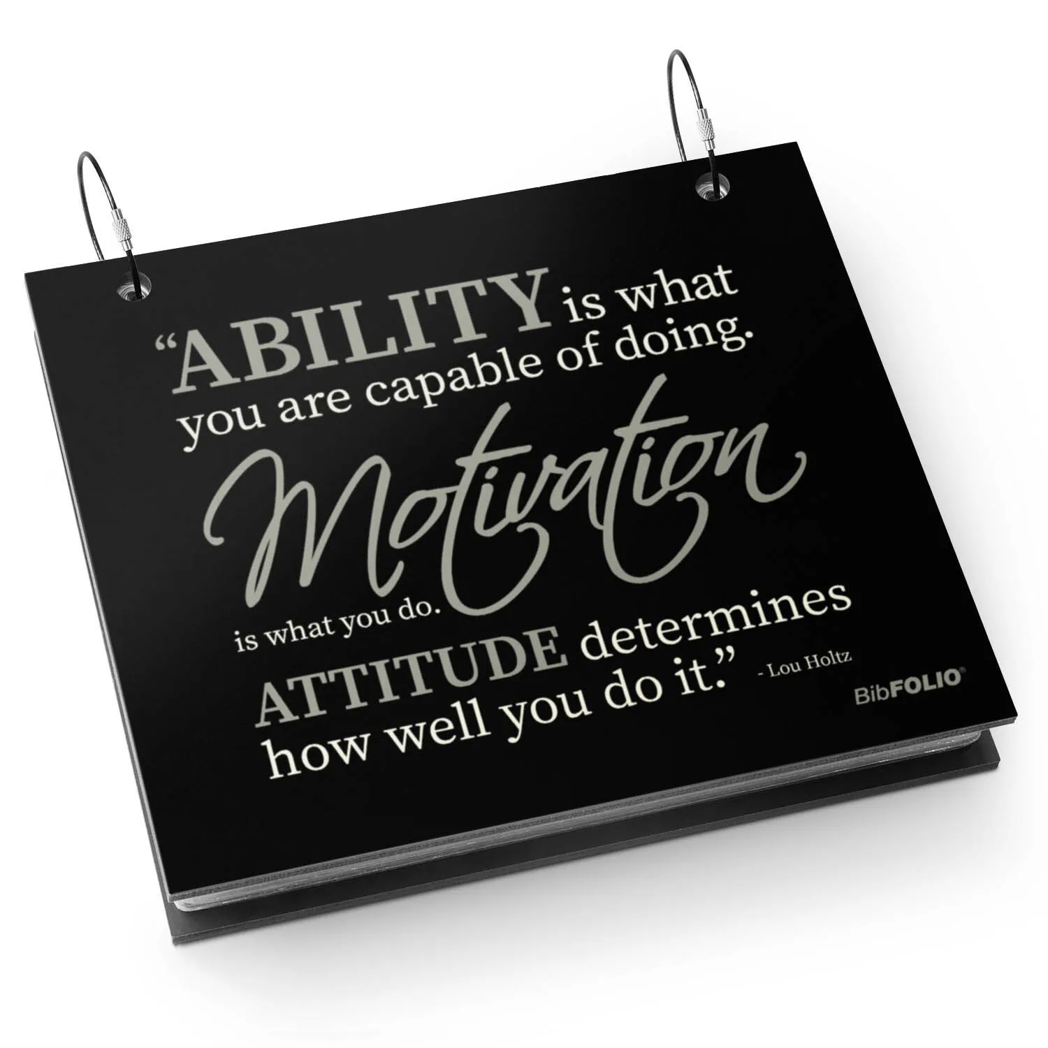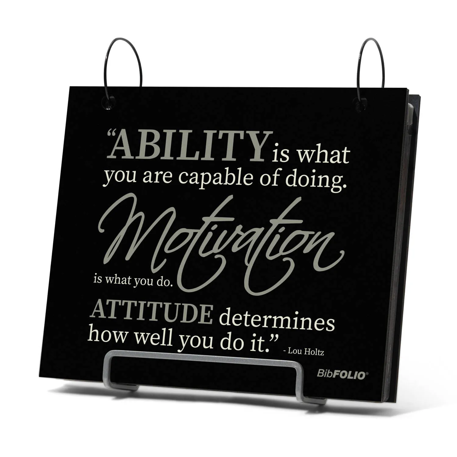 Our one-of-a-kind “Ability. Motivation. Attitude” BibFOLIO® Race Bib Album is the perfect choice for any runner to archive, preserve, and display their hard-earned race bibs. The race bib album displays a unique motivational message: “Ability is what you are capable of doing. Motivation is what you do. Attitude determines how well you do it” in order to keep any runner focused and determined to reach their running goals. Place the album on a table, a shelf, or desk – both at home or in the office to celebrate your running memories and achievements. Crafted from sturdy wood that is hand-finished and fitted with twist cable rings, each album is as functional as it is stylish. To add bibs, unscrew the rings and slide them through the holes at the top of the bib or protector sleeve (if used), and close the rings for a unique album runners will love and cherish. Perfect keepsake gift for a determined runner for any occasion.