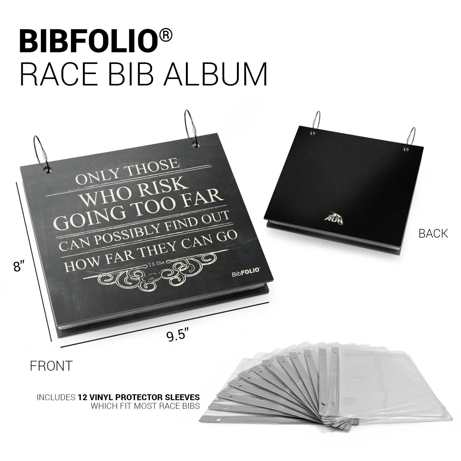 - Additional BibFOLIO Race Bib Vinyl Protector Sleeves (in packs of 12) and My Race STATS Inserts available