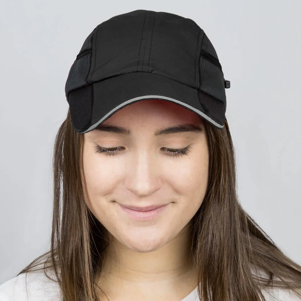 The CoolRun pocket hat for runners is super lightweight and moisture-wicking. This running hat features ventilated mesh panels on both sides as well as reflective safety piping on the brim for ultimate comfort and extra safety while out on a run. Our comfortable CoolRun pocket hat conveniently offers two zipper pockets on each side to hold your running and everyday essentials such as: keys, money, energy gels, and ID.