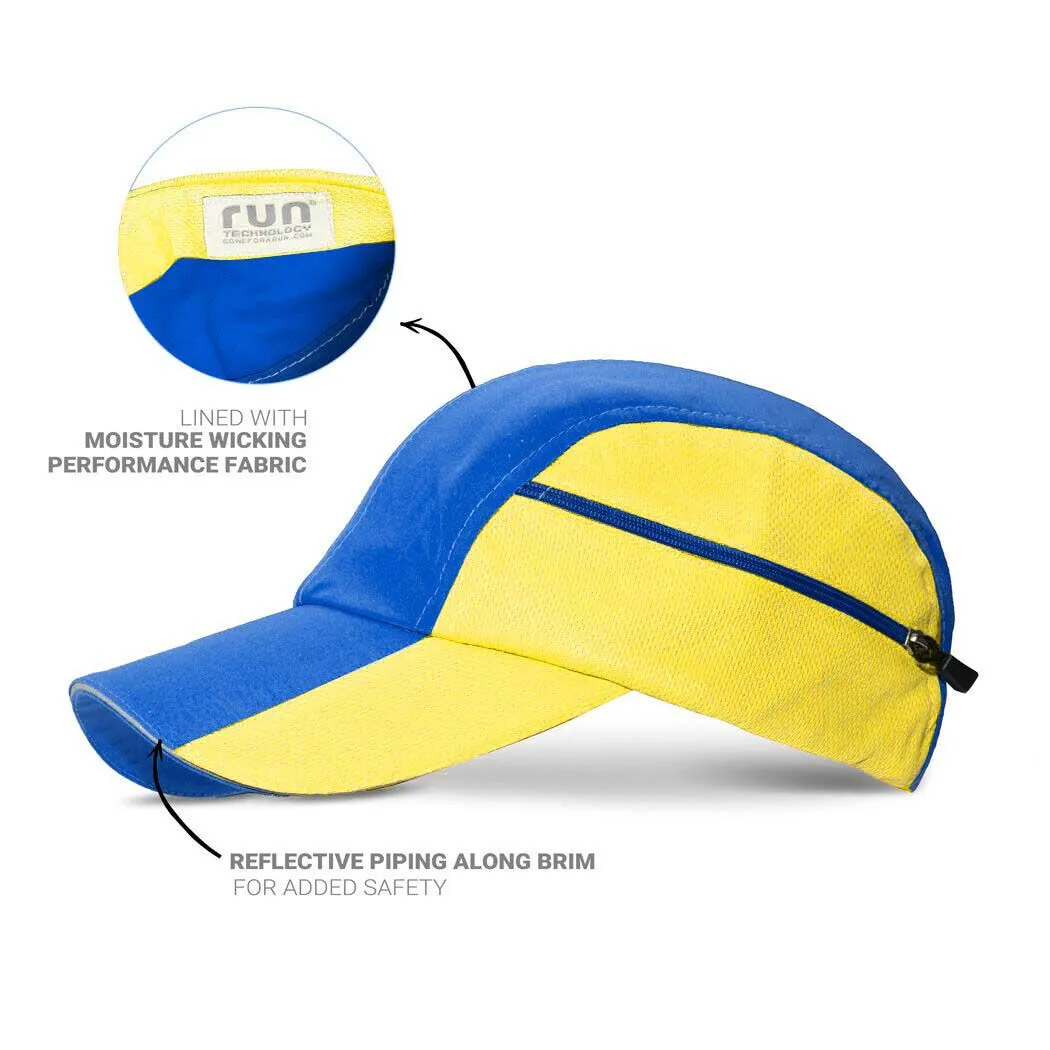 The CoolRun pocket hat for runners is super lightweight and moisture-wicking. This running hat features ventilated mesh panels on both sides as well as reflective safety piping on the brim for ultimate comfort and extra safety while out on a run. Our comfortable CoolRun pocket hat conveniently offers two zipper pockets on each side to hold your running and everyday essentials such as: keys, money, energy gels, and ID.