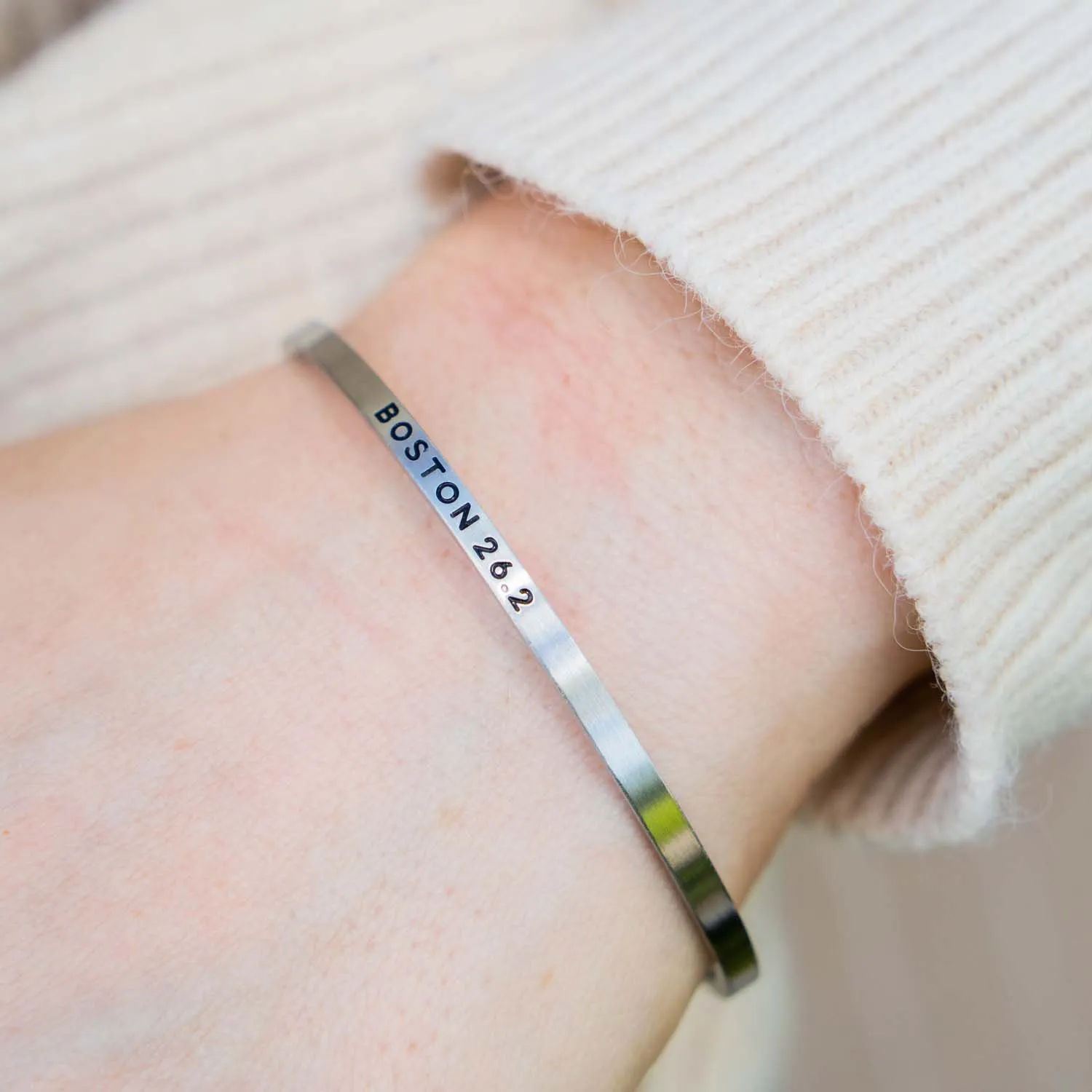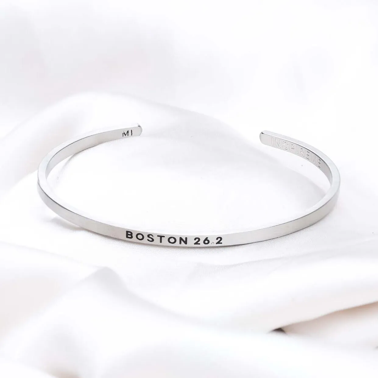 Celebrate your achievement with our “Boston 26.2” InspireME cuff bracelet for 26.2 runners. Made from high-quality materials, this stylish and durable bracelet is the perfect way to commemorate your journey to the marathon finish line. With its bold design and inspiring message, this cuff is a must-have accessory for any marathon runner. The “Boston 26.2” InspireME cuff bracelet is the perfect accessory for runners who want to celebrate their hard work and dedication.