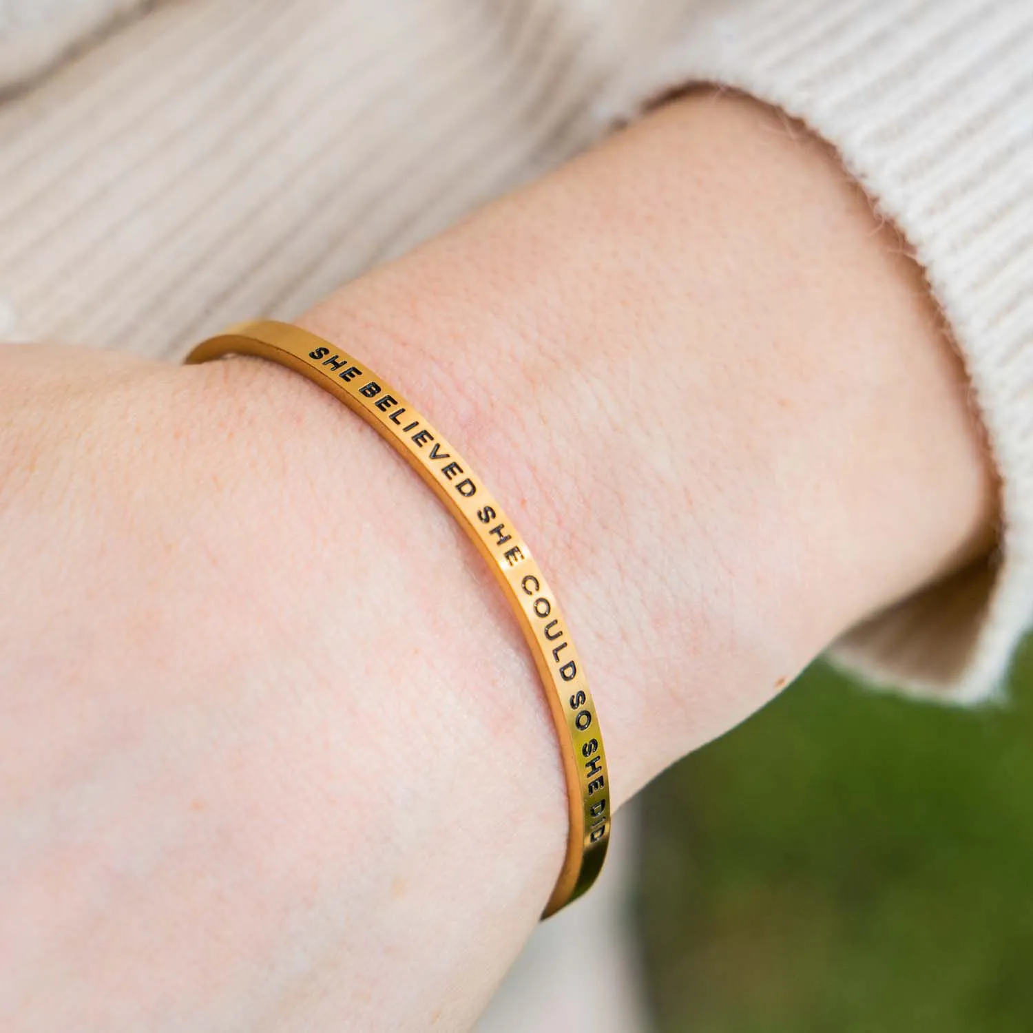 The “She Believed She Could” InspireME cuff bracelet is the perfect accessory for runner girls who need a little extra motivation. With its sleek design and powerful message, this bracelet serves as a constant reminder that anything is possible with belief and determination. Crafted from high-quality materials, this bracelet is both durable and stylish, making it the ideal choice for runners who want to look and feel their best. Whether you’re training for a race or just trying to stay active, the “She Believed She Could” InspireME cuff bracelet is a must-have accessory.