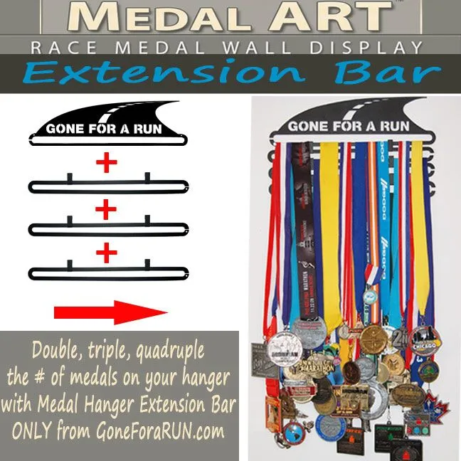Gone For a Run MedalART hangers are a great way to display your hard earned race medals. However, each one can only hold so many race awards. If you’ve run out of room on your race medal hanger, instantly expand its capacity with one of our MedalART hanger extension bars. These bars easily hang onto any MedalART hanger that is 13 inches wide or more. They add room for 12 to 15 extra race medals, so that you can display your entire collection. To add additional room to your medal display, simply add more extension bars. Add up to three to double, triple or quadruple the number of medals in your display.
