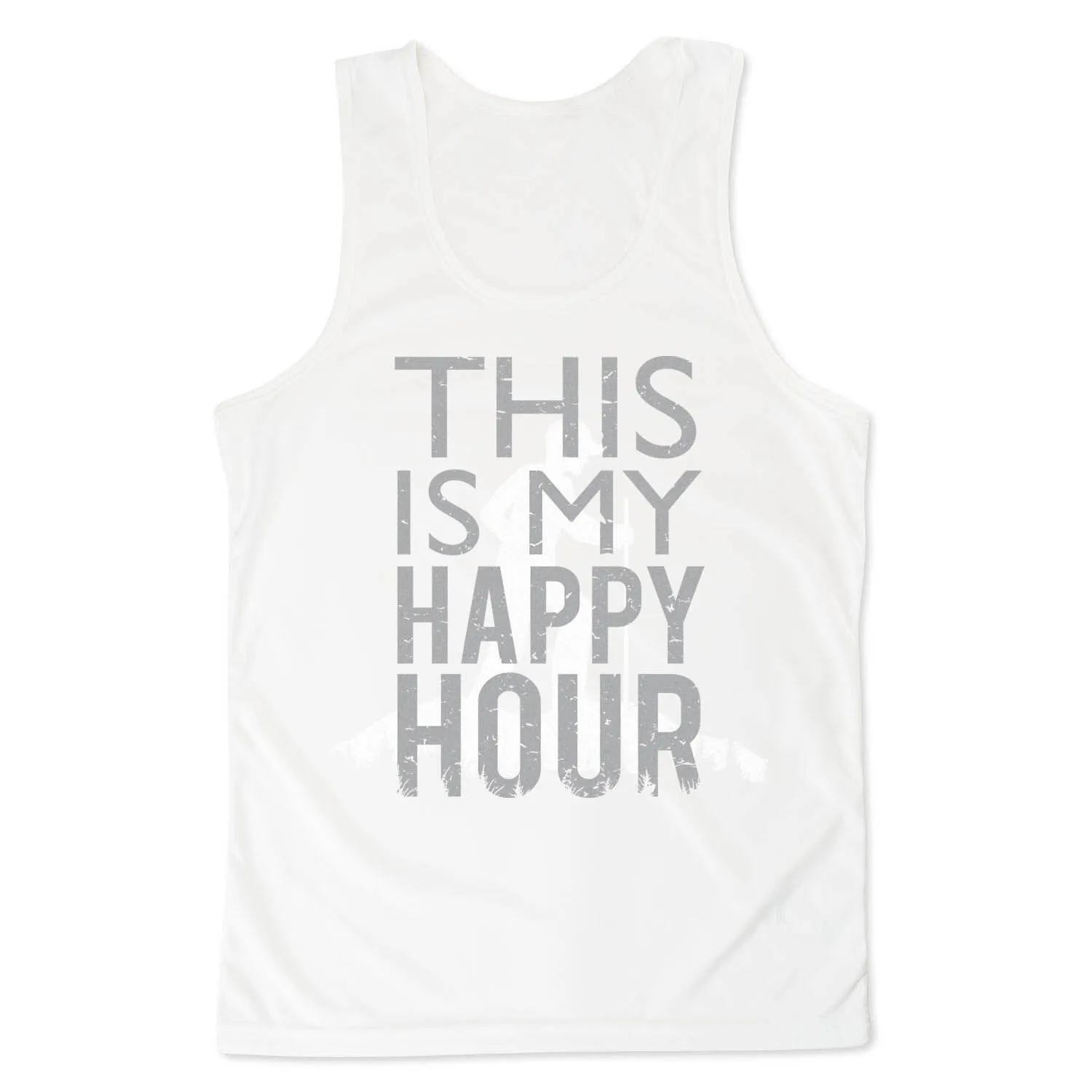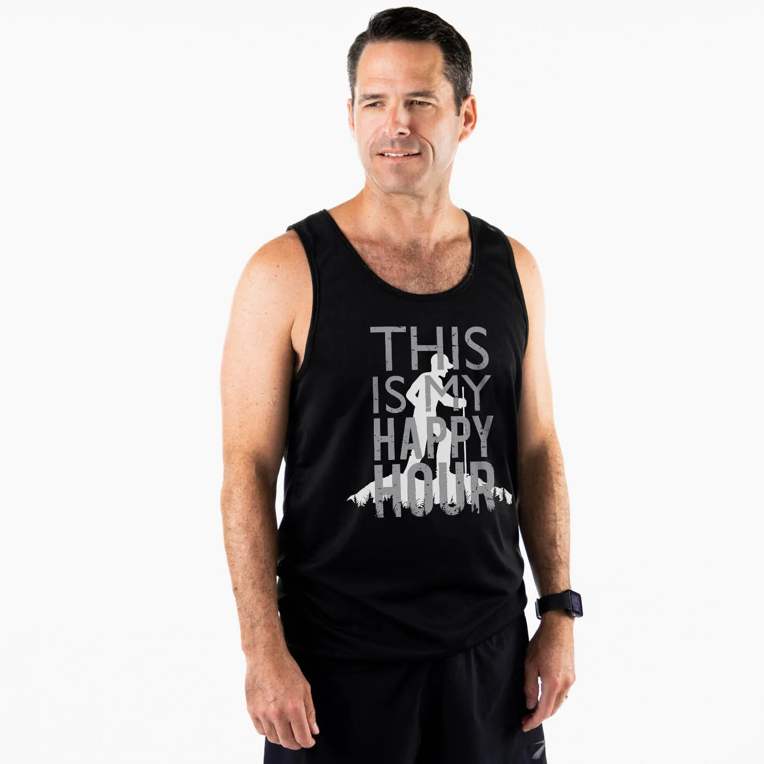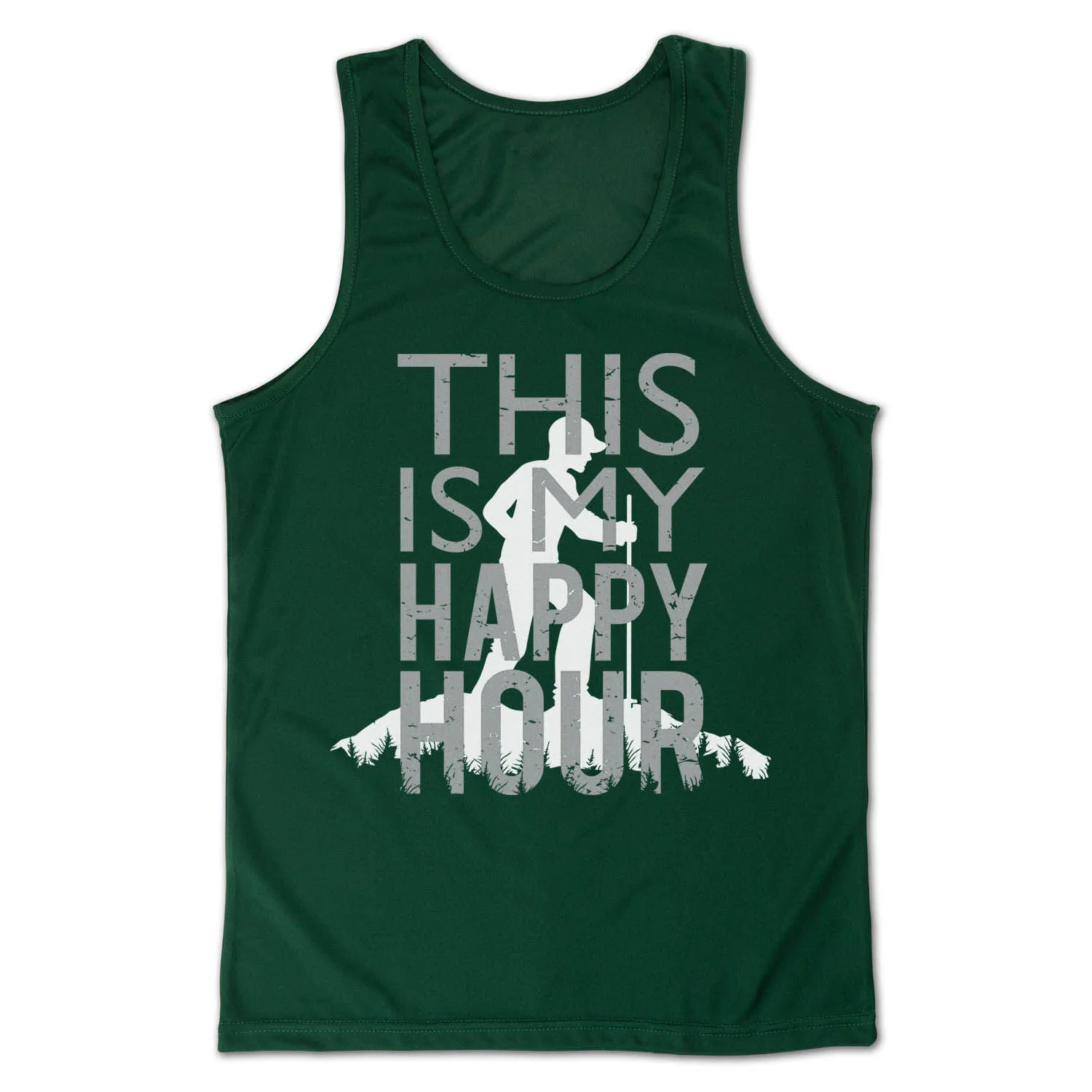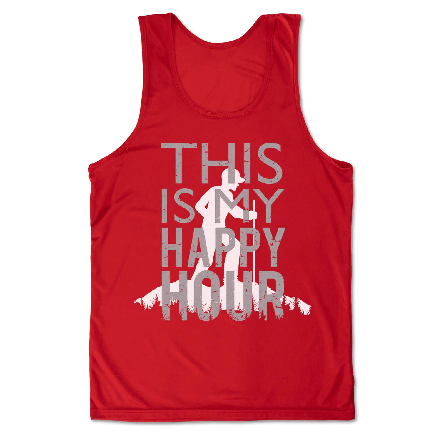 The hiking performance tank top for men features an exclusive This Is My Happy Hour Hiker design. Our moisture-wicking tank is made from 100% polyester to keep hikers dry and cool. The tank top offers a comfortable and relaxed fit that looks great when paired with any choice of athletic or everyday bottoms. This performance tank top for is perfect for everyday wear and an ideal gift for hikers for any occasion.
