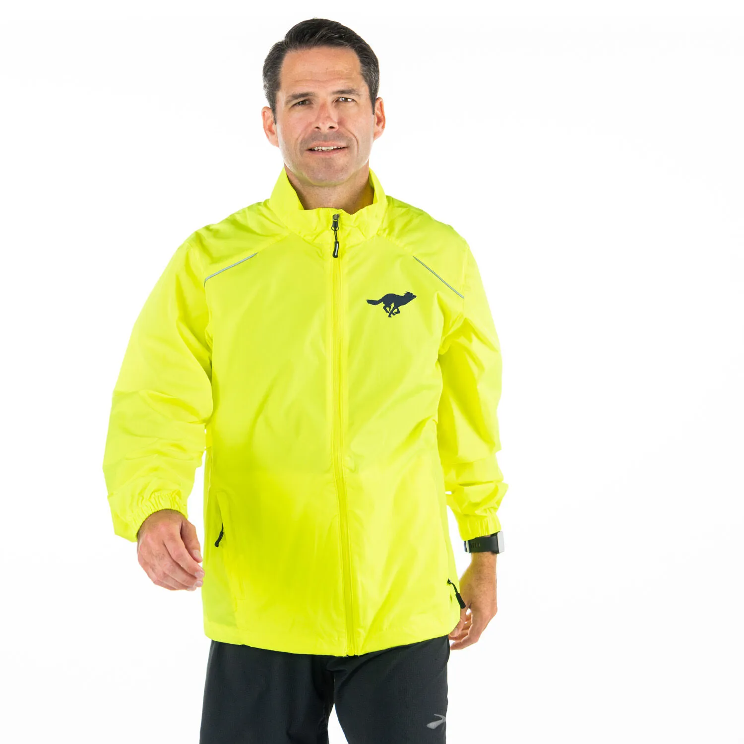 This Lone Wolf Runner lightweight jacket offers safety and comfort for every runner. Our 100% polyester safety yellow jacket features center front reverse coil autolock zipper with reflective toggle, underarm vents, lower front concealed zippered pockets with reflective toggles, audio port access through inside lower left pocket, elasticized cuffs, adjustable shockcord at hem, as well as reflective piping at shoulder yoke and center back yoke. Every runner values comfort and extra safety while out on a run.