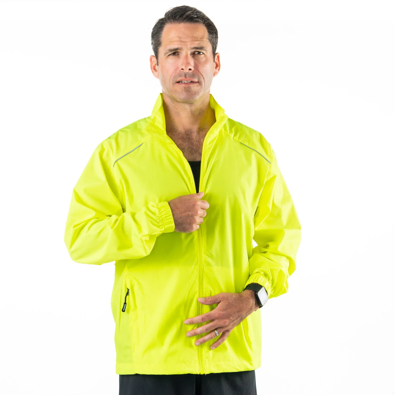This lightweight jacket offers safety and comfort for every runner. Our 100% polyester safety yellow jacket features center front reverse coil autolock zipper with reflective toggle, underarm vents, lower front concealed zippered pockets with reflective toggles, audio port access through inside lower left pocket, elasticized cuffs, adjustable shockcord at hem, as well as reflective piping at shoulder yoke and center back yoke. Every runner values comfort and extra safety while out on a run.