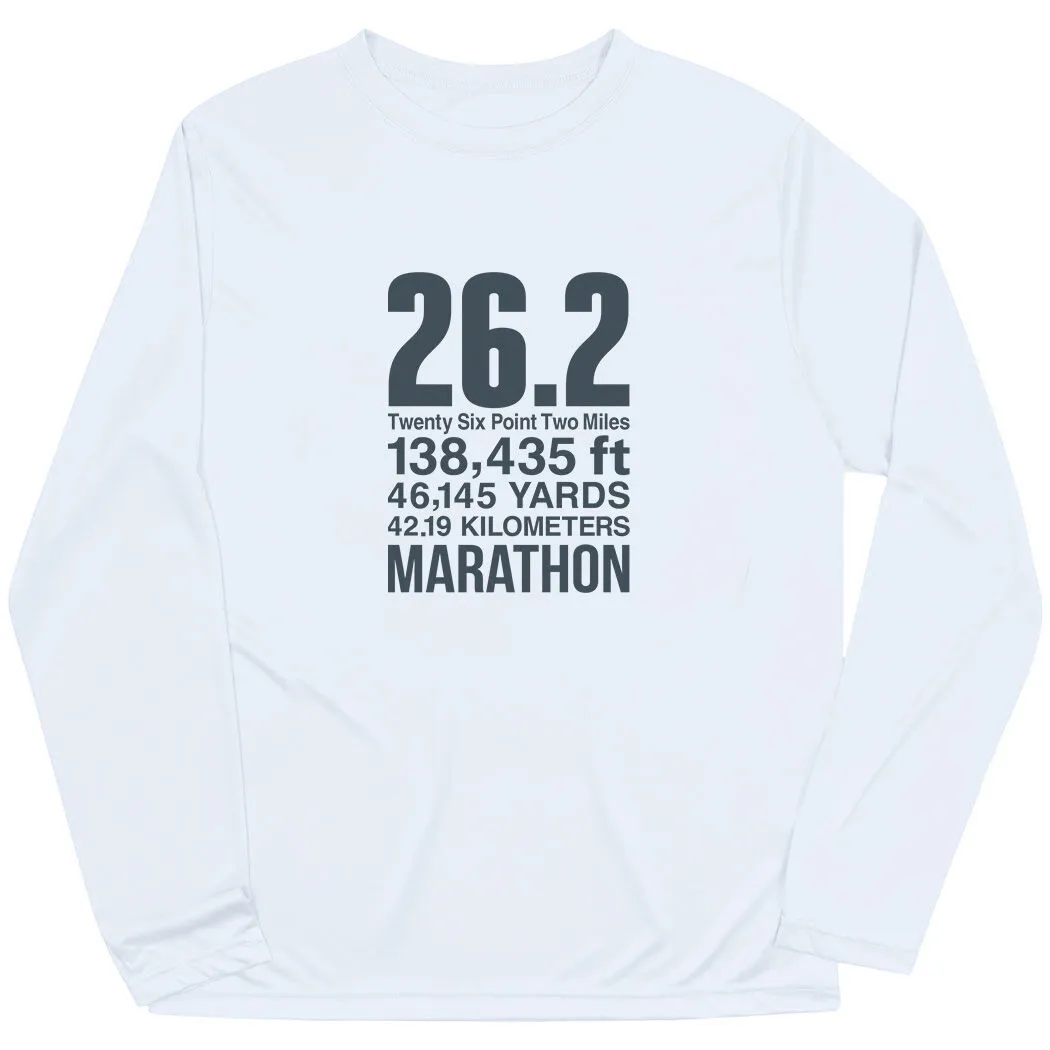 Show off your marathoner pride in our men’s long sleeve performance tee featuring our exclusive 26.2 Math Miles design. Our long sleeve tech tee is made from 100% polyester interlock to keep runners dry and cool. The long sleeve performance tee offers a comfortable and relaxed fit that looks great when paired with any choice of athletic or everyday bottoms. This unique tech tee is perfect for everyday wear and an ideal running gift for any occasion.