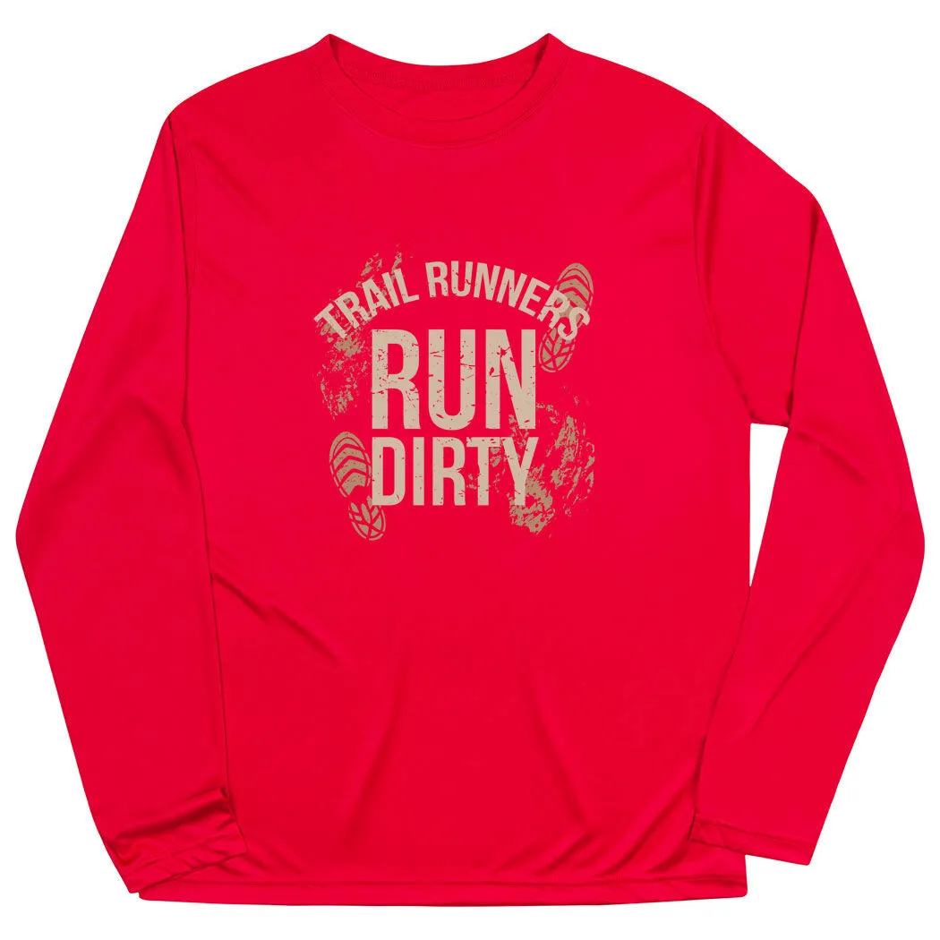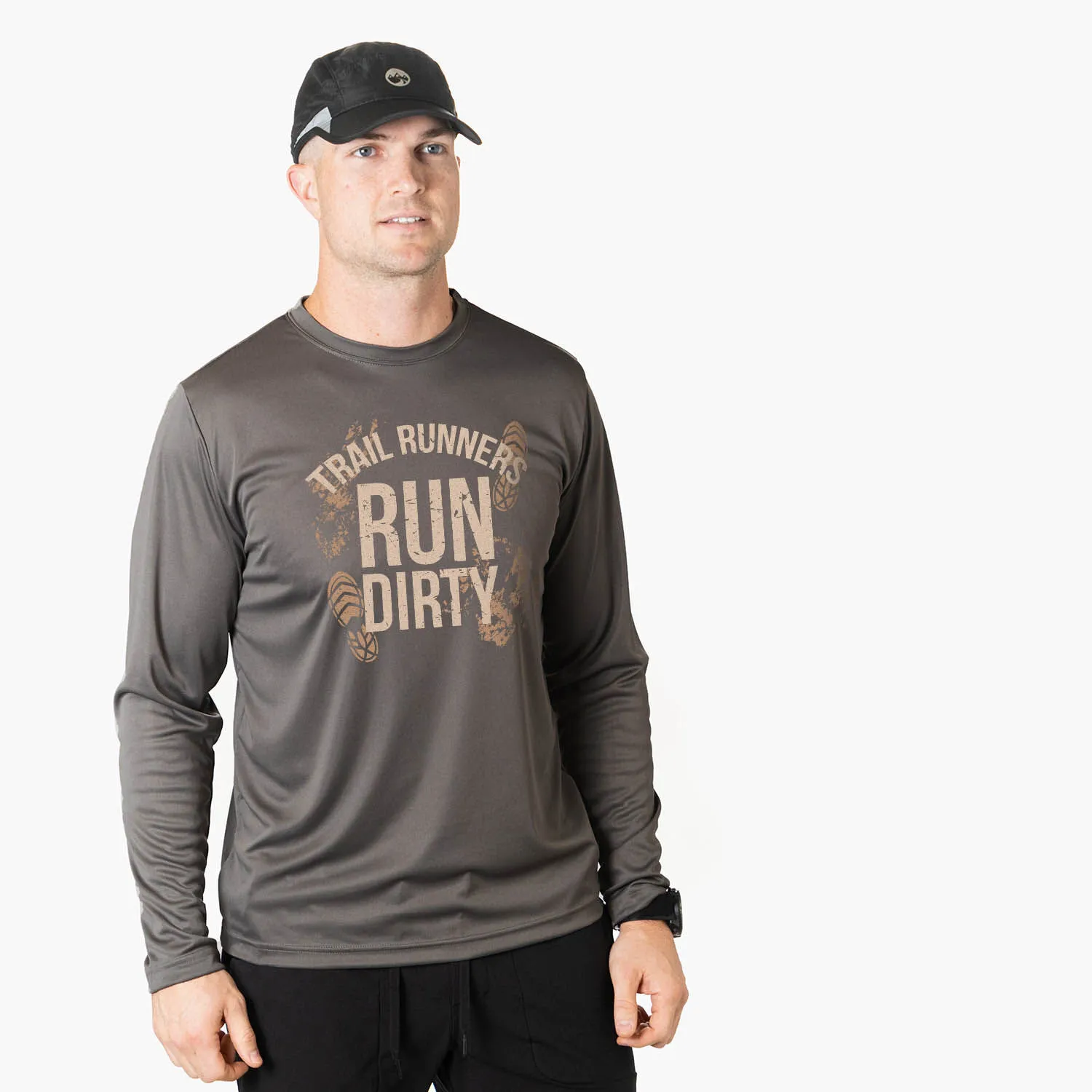 Run dirty through the trails in our men’s long sleeve performance tee. Our long sleeve tech tee is made from 100% polyester interlock to keep runners dry and cool. The long sleeve performance tee offers a comfortable and relaxed fit that looks great when paired with any choice of athletic or everyday bottoms. This unique tech tee is perfect for everyday wear and an ideal running gift for any occasion. Any trail runner will rock this top.
