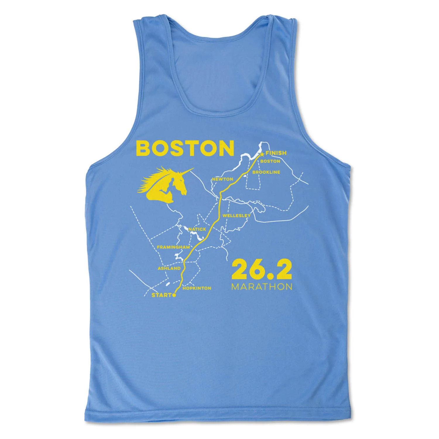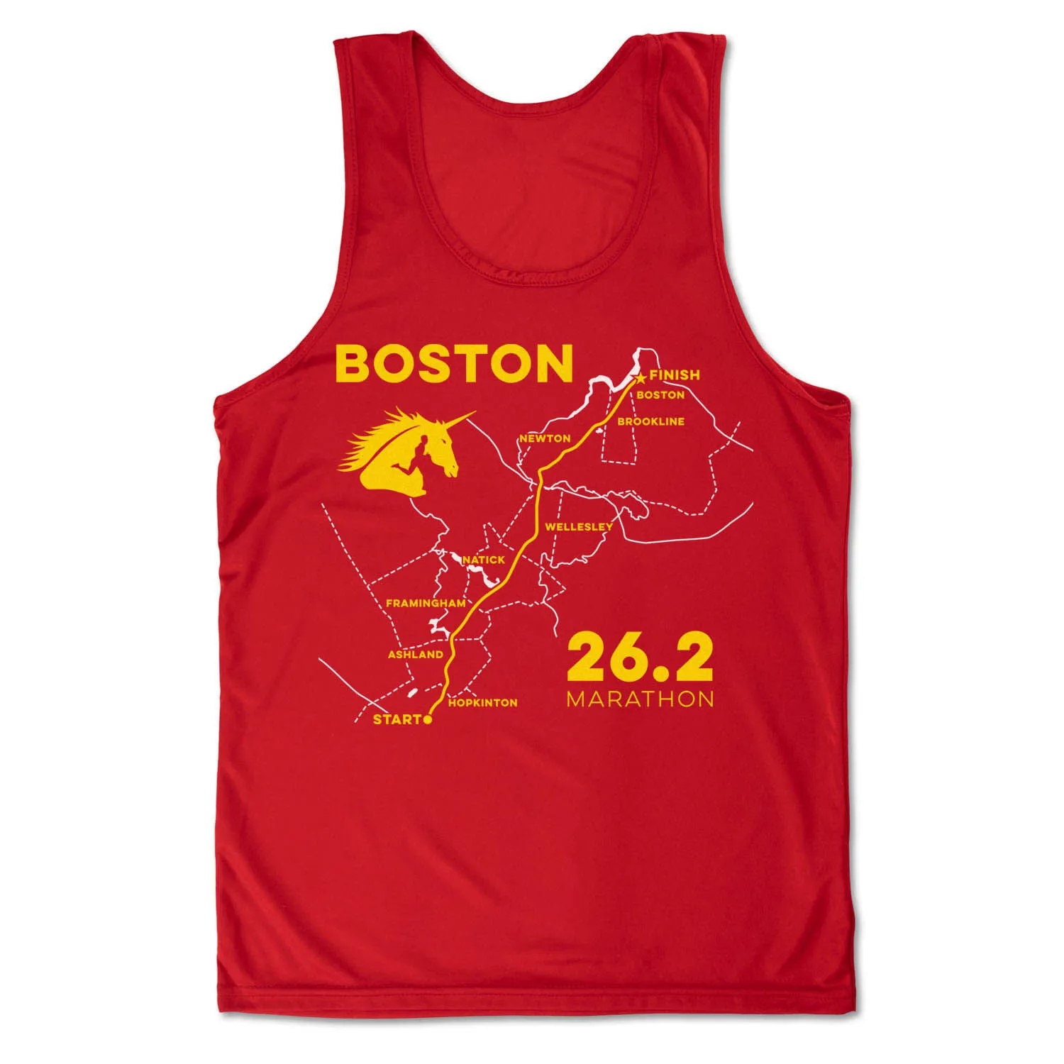 The running performance tank top for men features an exclusive Boston Route design. Our moisture-wicking tank is made from 100% polyester to keep runners dry and cool. The tank top offers a comfortable and relaxed fit that looks great when paired with any choice of athletic or everyday bottoms. This performance tank top for is perfect for everyday wear and an ideal gift for marathoners for any occasion.