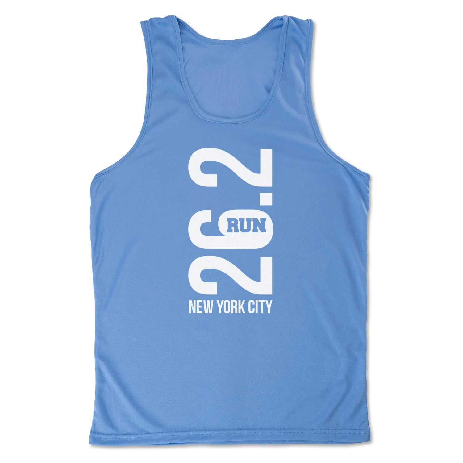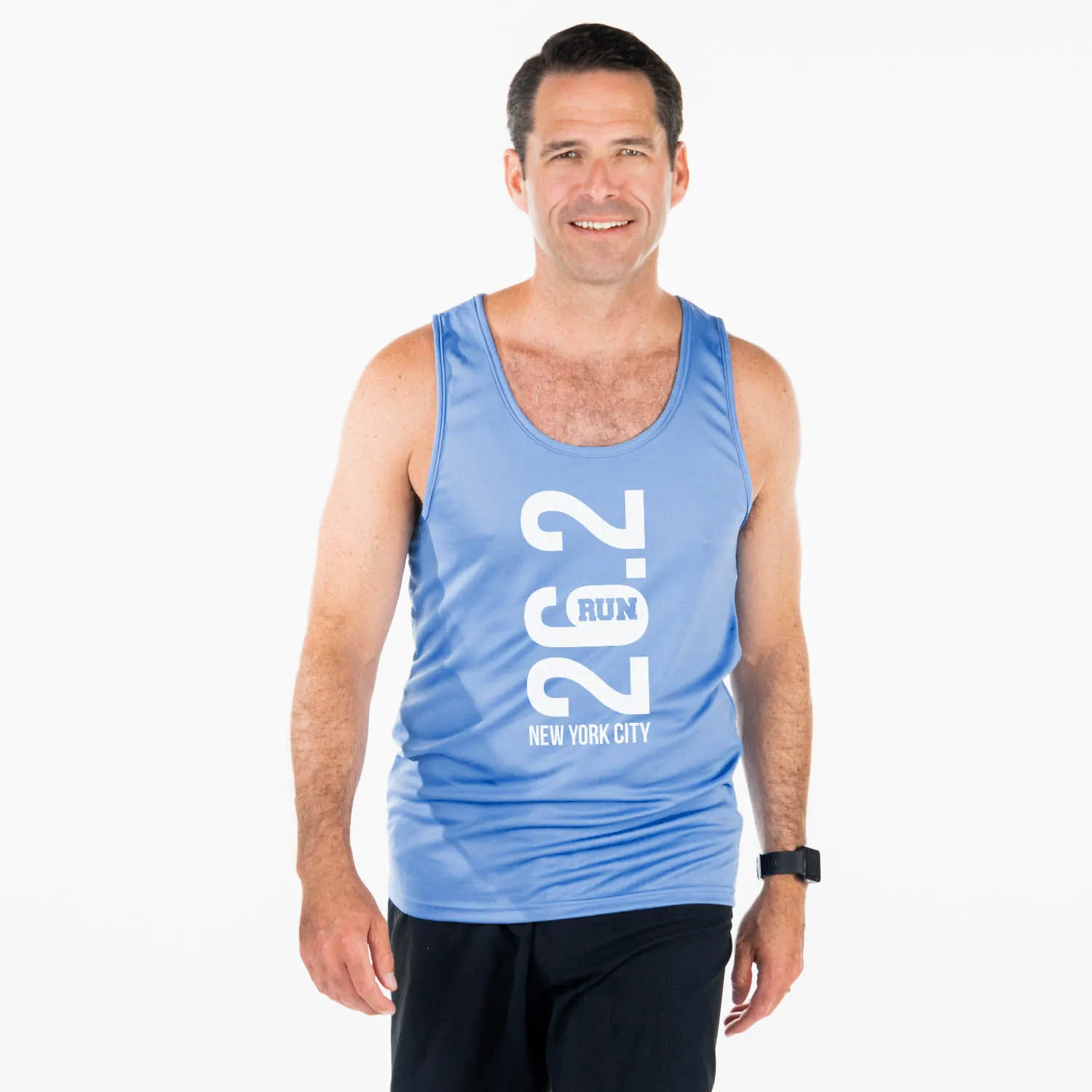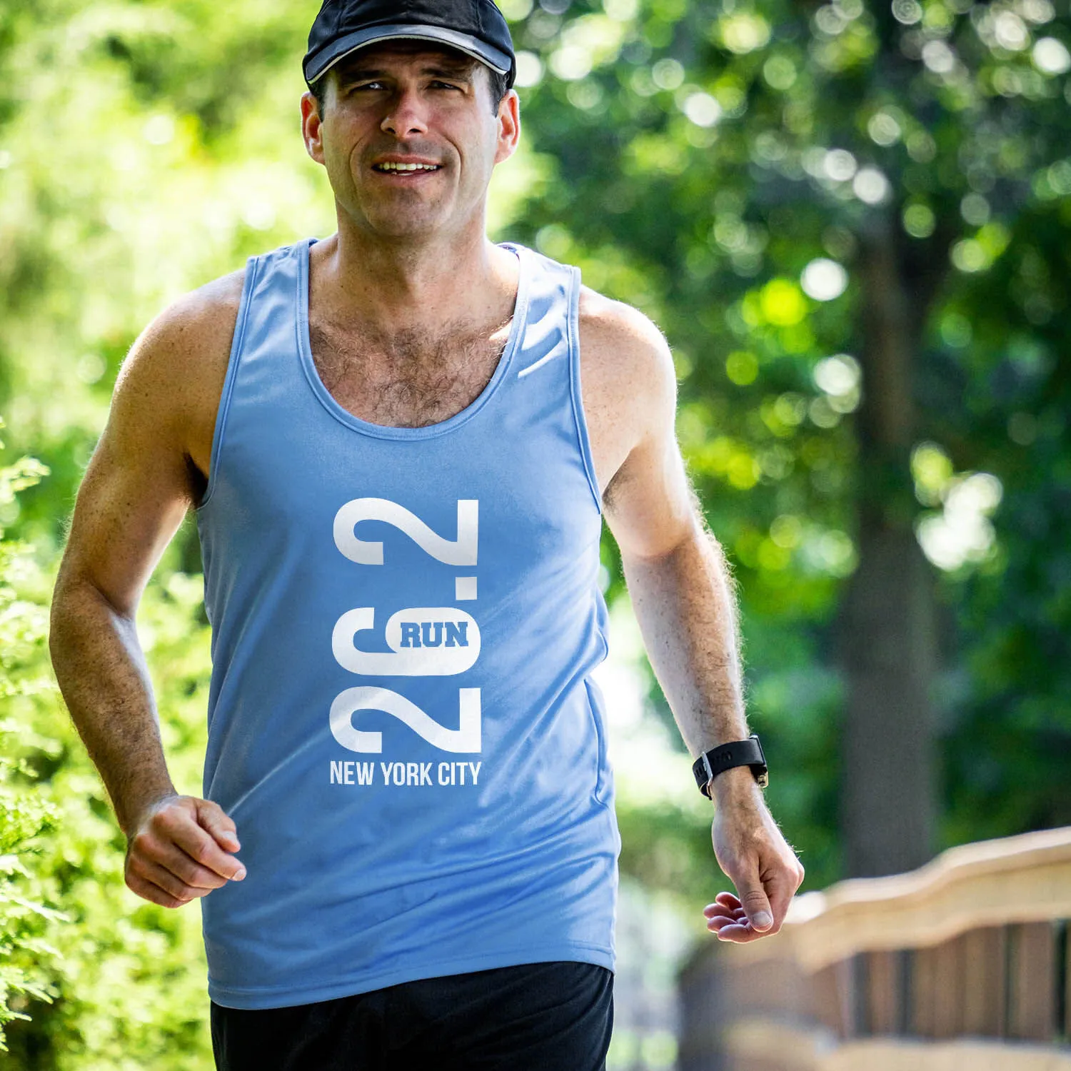 The running performance tank top for men features an exclusive New York City 26.2 Vertical design. Our moisture-wicking tank is made from 100% polyester to keep runners dry and cool. The tank top offers a comfortable and relaxed fit that looks great when paired with any choice of athletic or everyday bottoms. This performance tank top for is perfect for everyday wear and an ideal gift for marathoners for any occasion.
