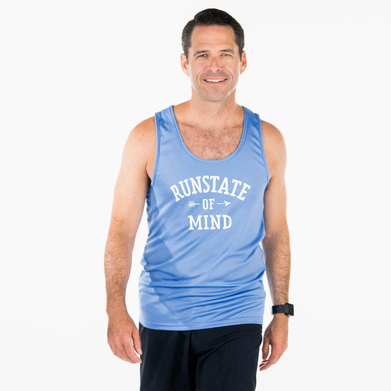 The running performance tank top for men features an exclusive RunState of Mind design. Our moisture-wicking tank is made from 100% polyester to keep runners dry and cool. The tank top offers a comfortable and relaxed fit that looks great when paired with any choice of athletic or everyday bottoms. This performance tank top for is perfect for everyday wear and an ideal gift for runners for any occasion.