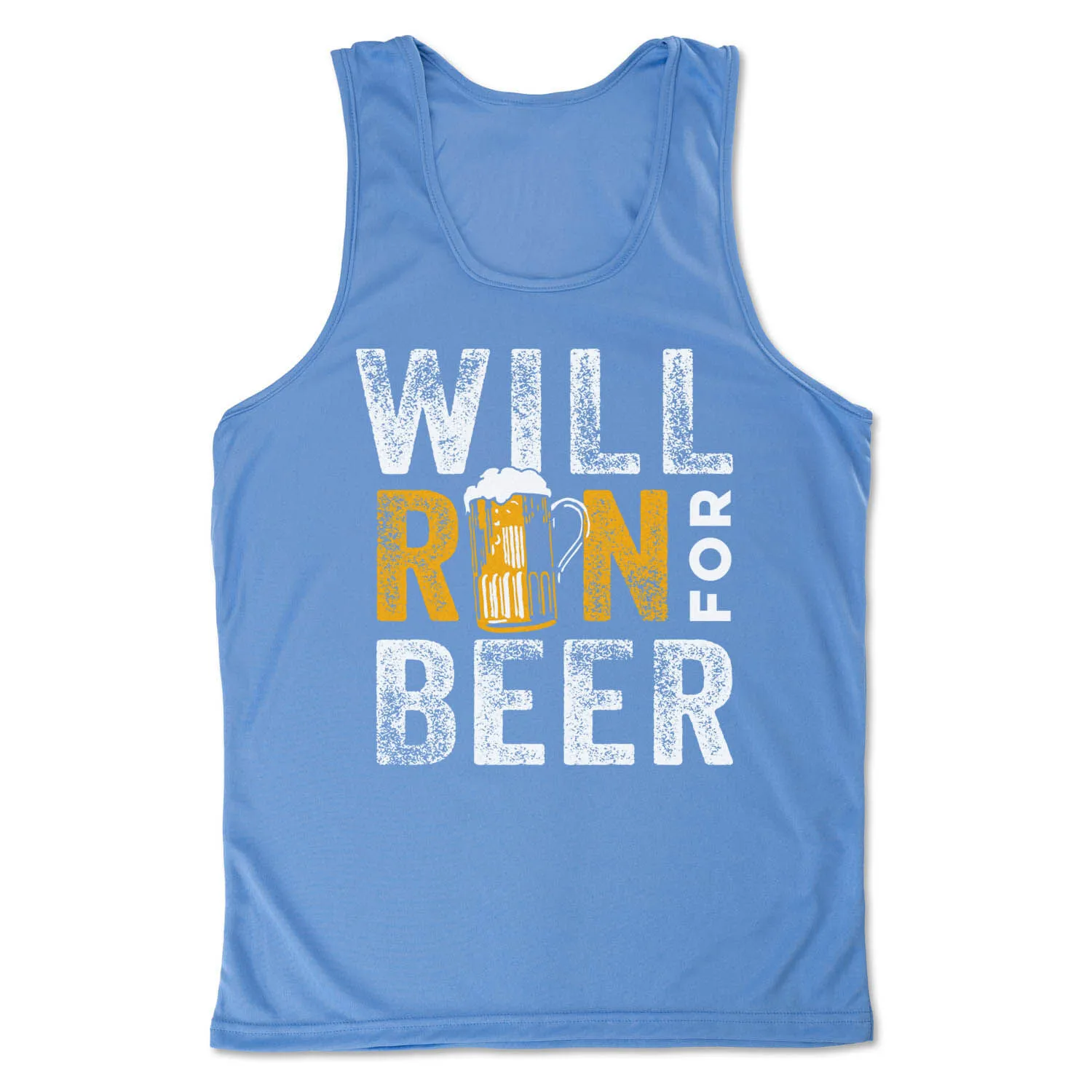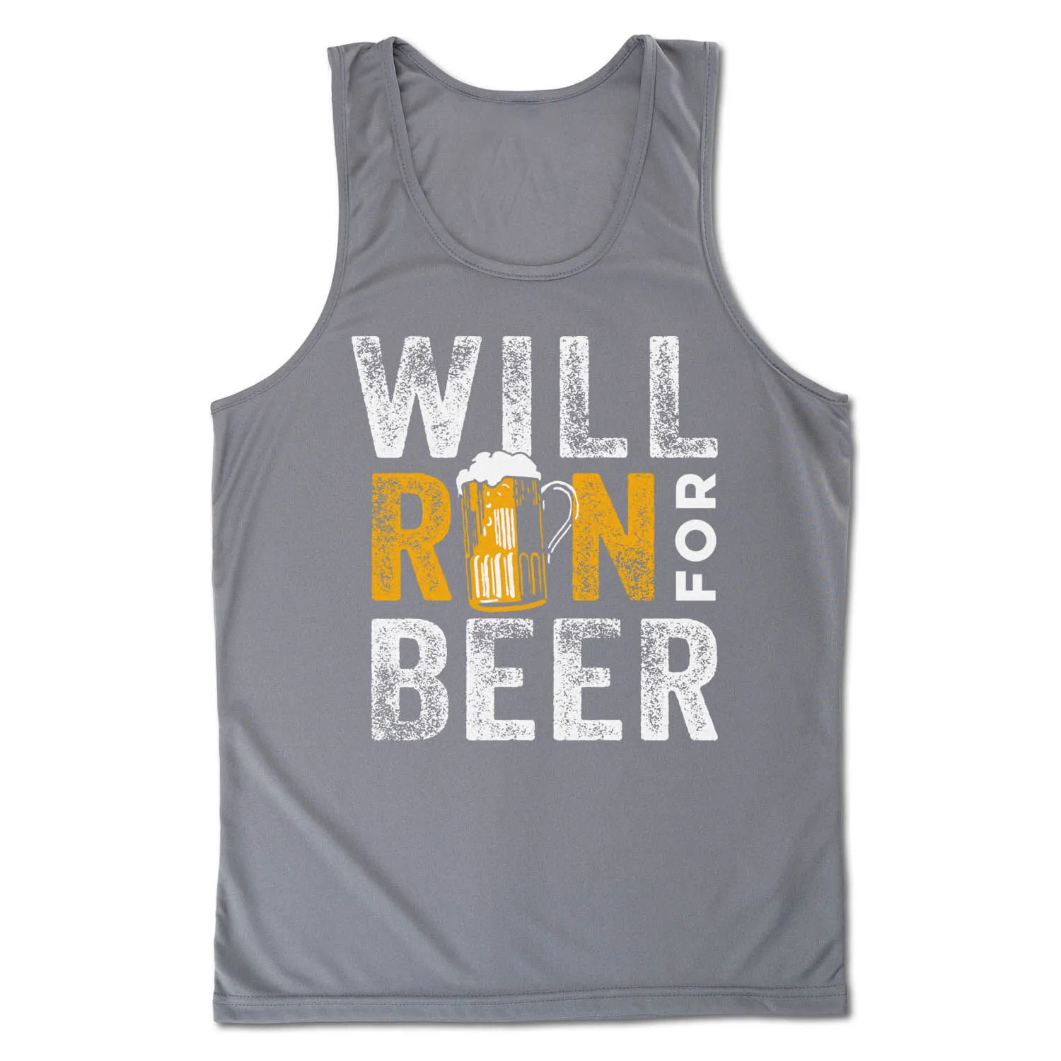 The running performance tank top for men features an exclusive Will Run For Beer design. Our moisture-wicking tank is made from 100% polyester to keep runners dry and cool. The tank top offers a comfortable and relaxed fit that looks great when paired with any choice of athletic or everyday bottoms. This performance tank top for is perfect for everyday wear and an ideal gift for runners for any occasion.