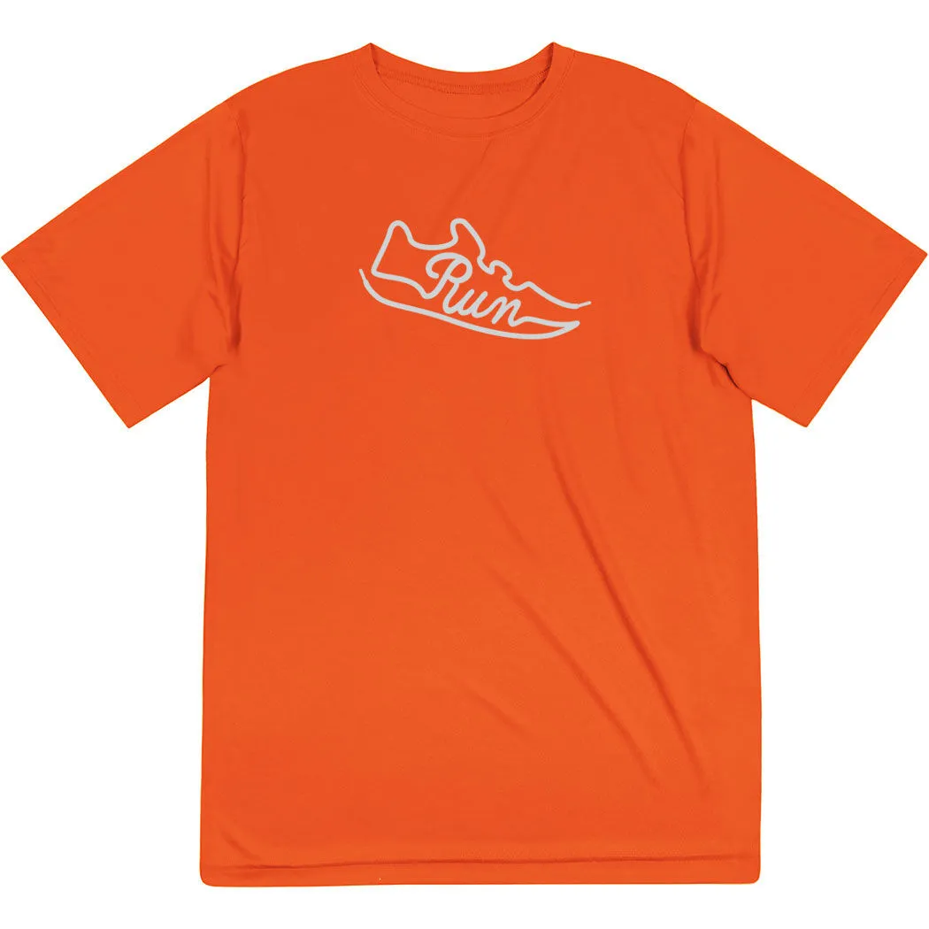 Show off your running pride in our men’s short sleeve tech tee featuring a one-of-a-kind Run Shoe design. Our V-neck performance tee is made from 100% polyester interlock to keep runners dry and cool. The short sleeve tech tee offers a comfortable and relaxed fit that looks great when paired with any choice of athletic or everyday bottoms. This unique tech tee is perfect for everyday wear and an ideal running gift for any occasion.