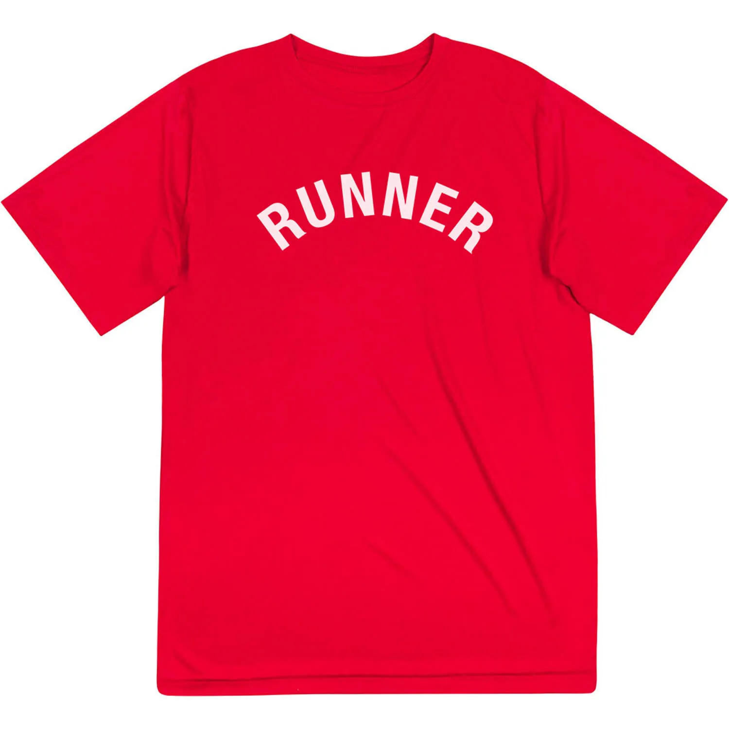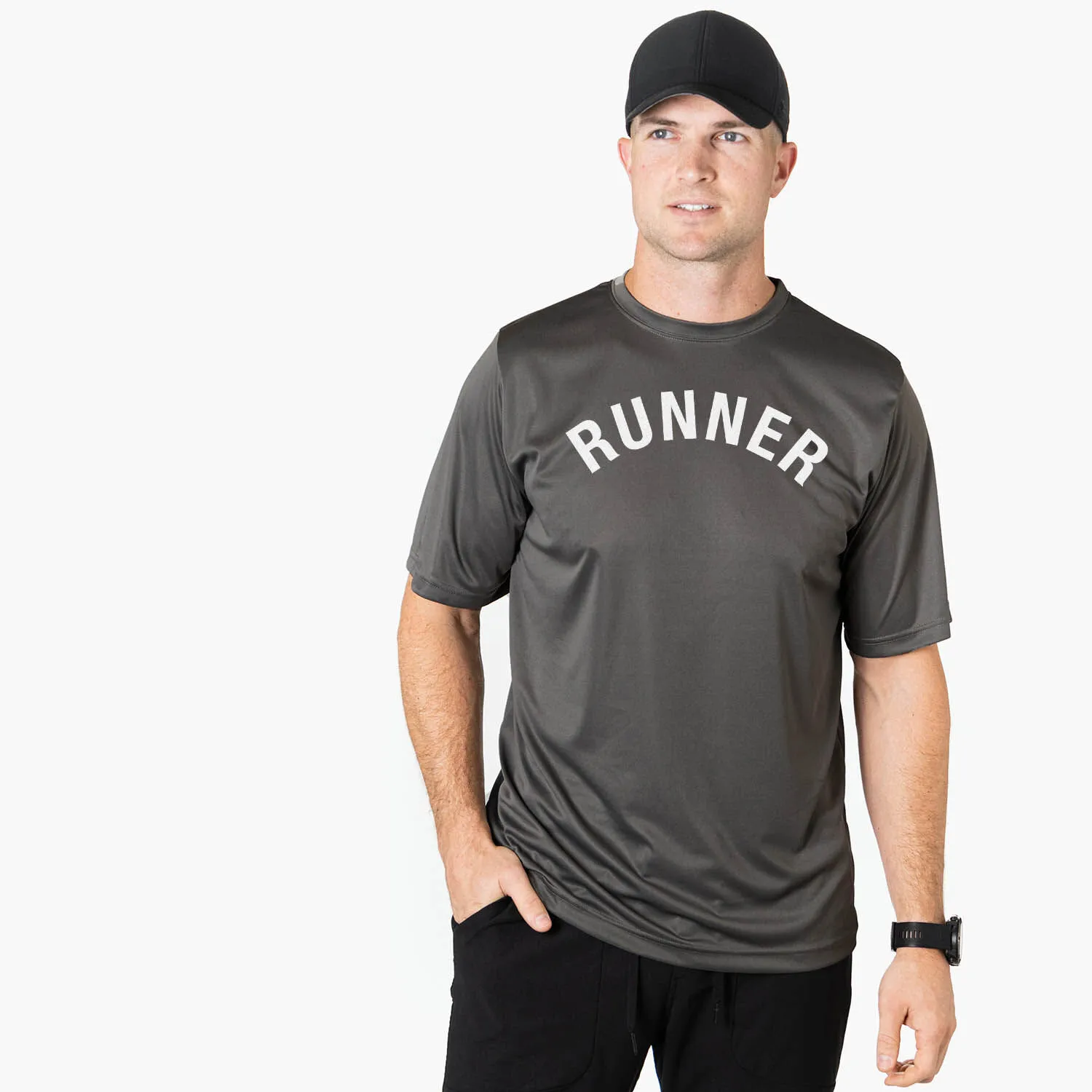 Show off your running pride in our men’s short sleeve tech tee featuring our exclusive Runner Arc design. Our V-neck performance tee is made from 100% polyester interlock to keep runners dry and cool. The short sleeve tech tee offers a comfortable and relaxed fit that looks great when paired with any choice of athletic or everyday bottoms. This unique tech tee is perfect for everyday wear and an ideal running gift for any occasion.