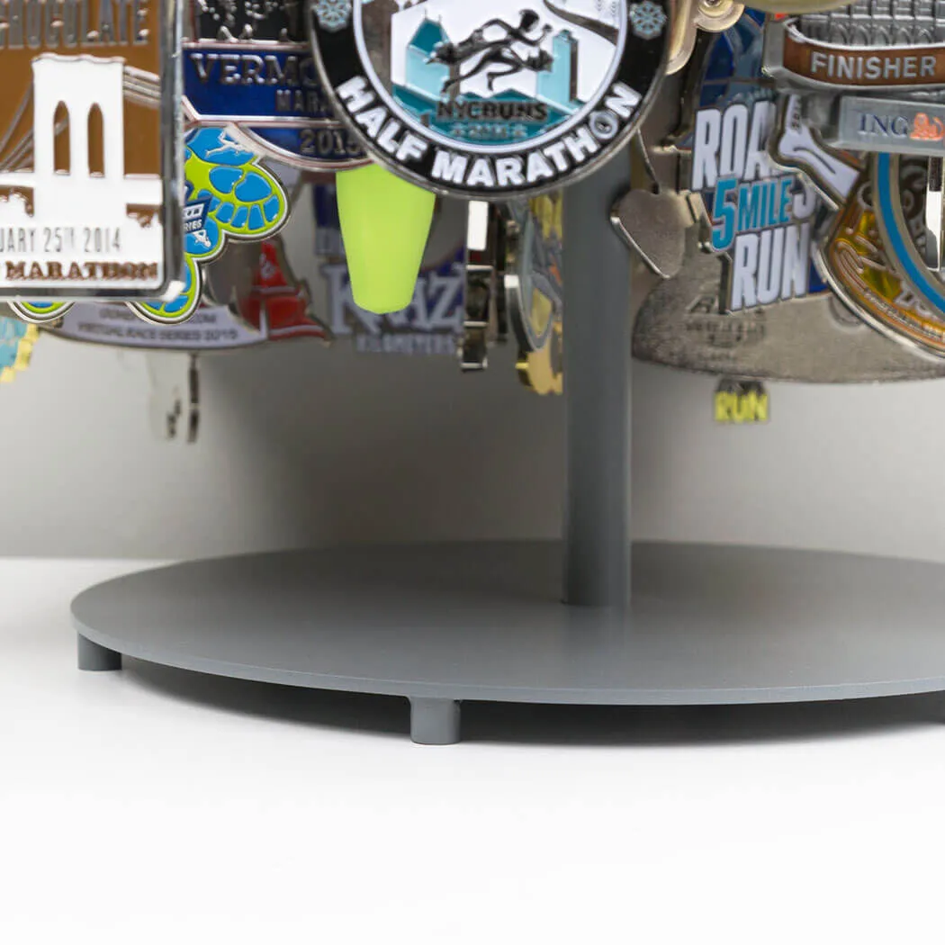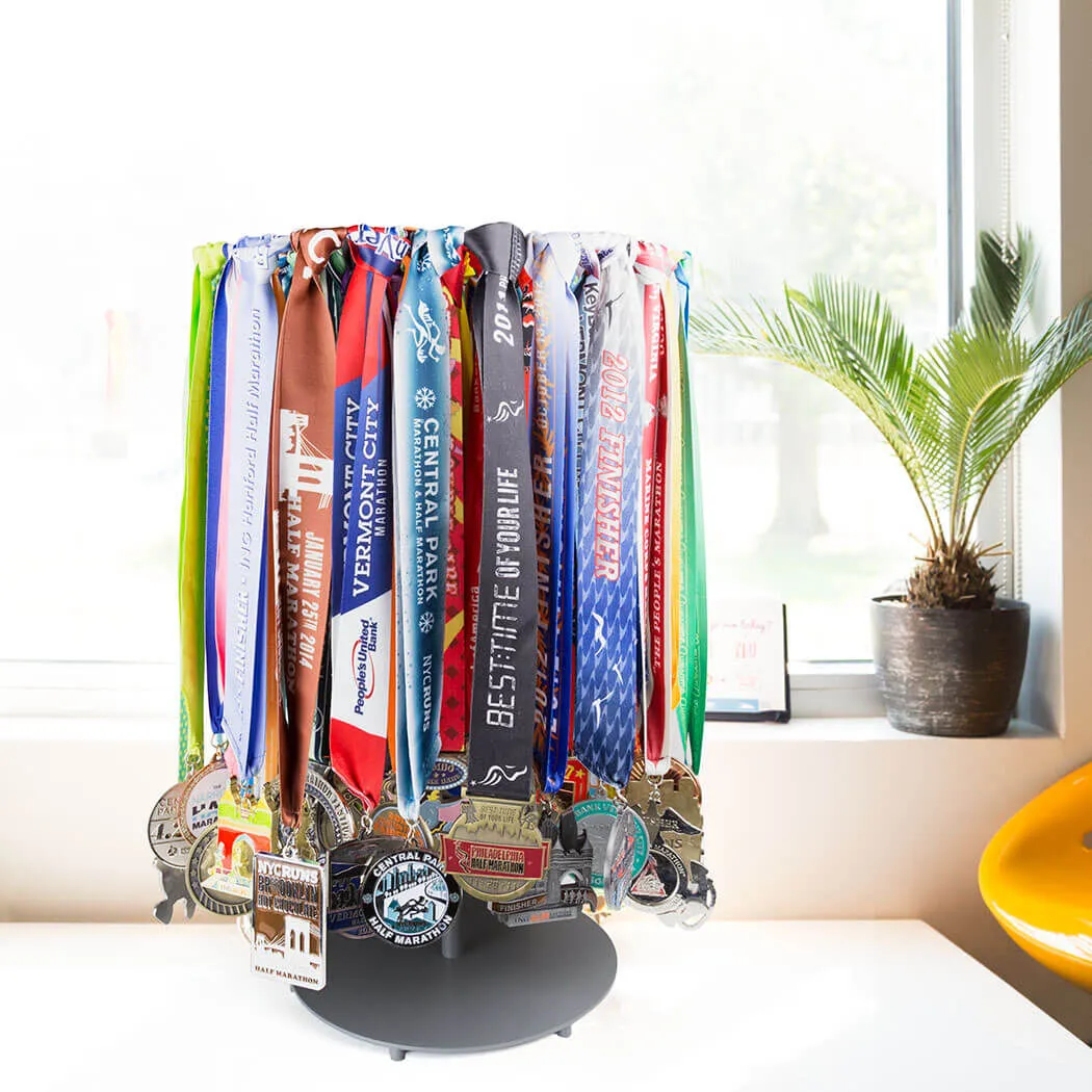 Dust off your collection of race medals and put them on display with the premier tabletop running race medal display from Gone For a Run. This running medal display is an attractive way to turn dozens of race medals into a real work of art. It’s expertly crafted from hand-forged steel to ensure its durability. The stand includes several metal rings from which you can hang your medals in any order you wish. It holds over 60 race medals, so there is plenty of room for your entire collection. Your guests will love to admire this great conversation piece. This premier race display stand is incredibly easy to assemble and requires no tools.