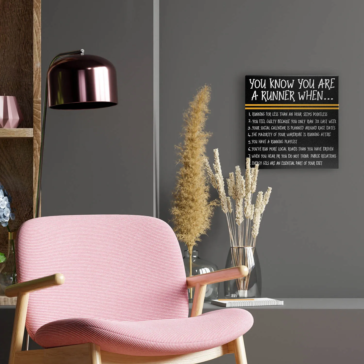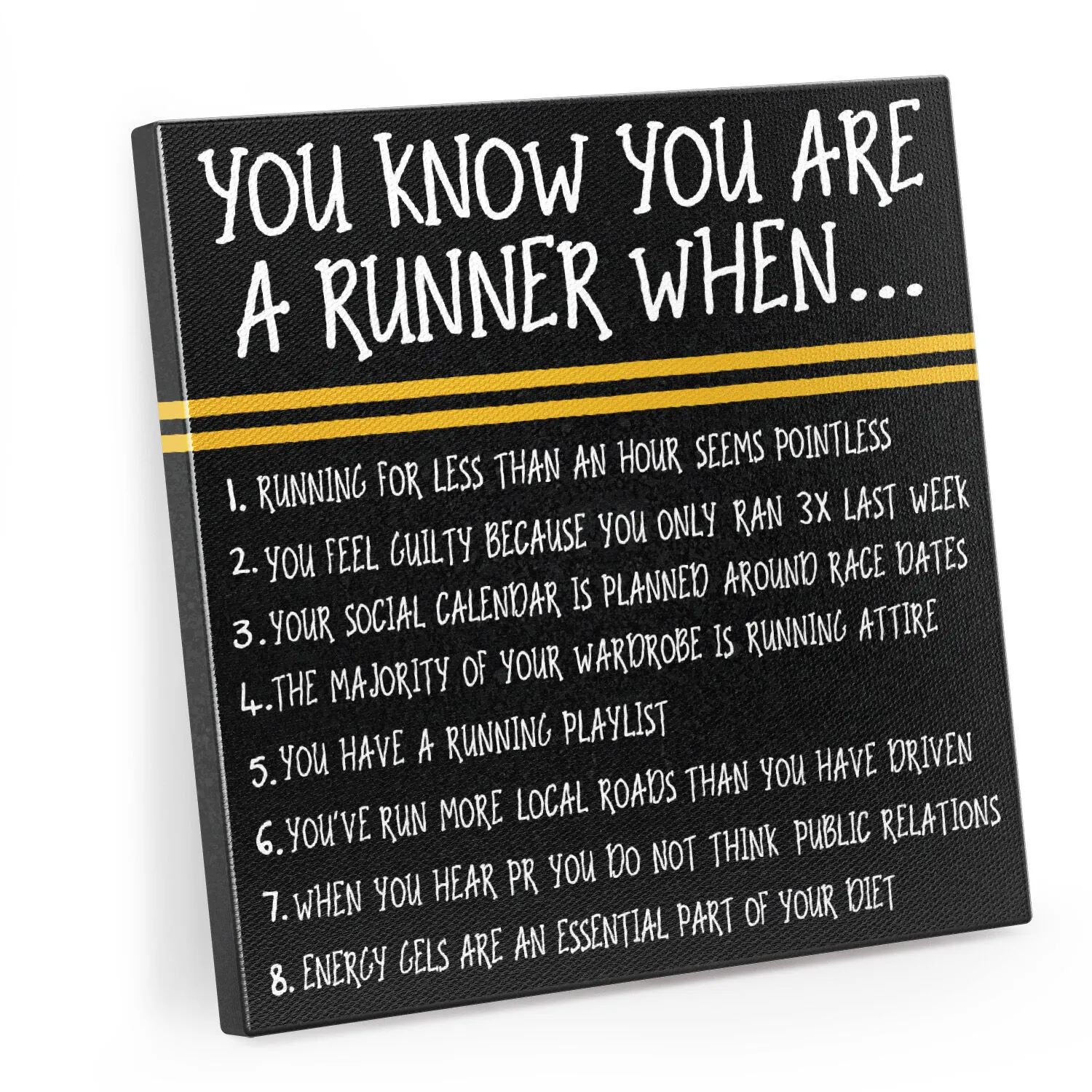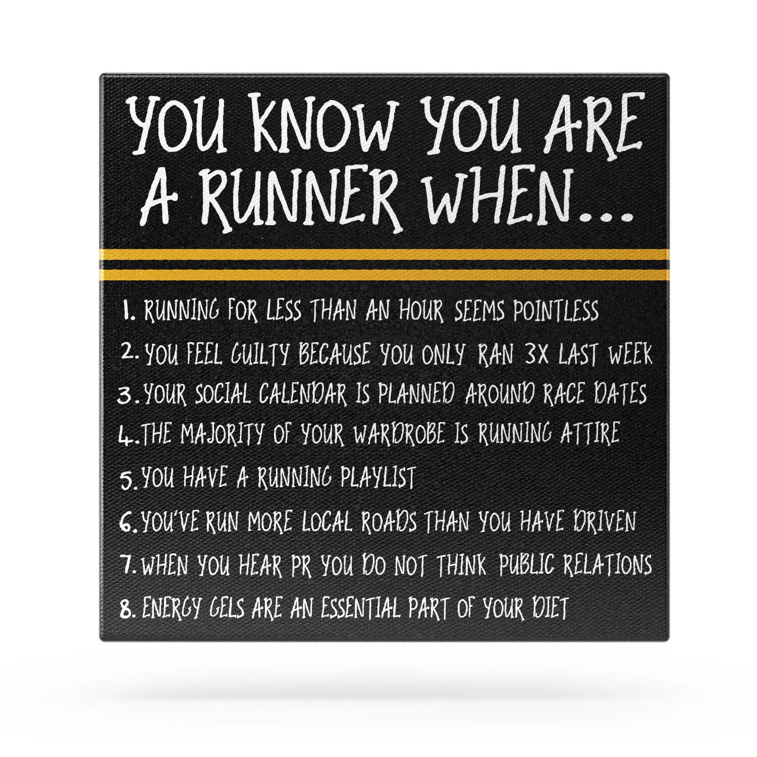 Decorate any room with inspiration and running memories with our one-of-a-kind You Know You’re A Runner When running canvas. This 12″ X 12″ fine wall art features an exclusive design and artist-grade wrapped edges to complete the look. Bring your passion for running to life with the texture and depth of this unique stretched canvas. Perfect to brighten up and elevate any room or office and a thoughtful gift for any occasion. Hardware included for easy hanging.