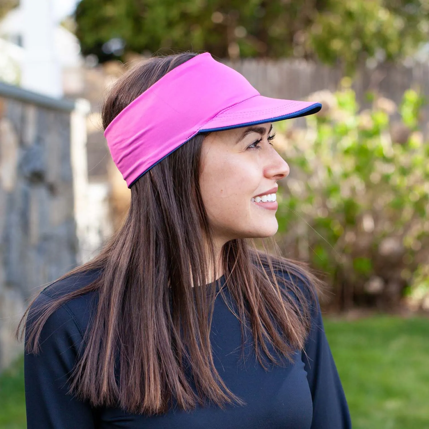 It’s running o’clock somewhere! Our lightweight performance visor features a wide brim and stretchable band for all-day comfort. The breathable and moisture-wicking material keeps you dry and cool during any activity. These foldable visors are also reversible, offering two unique designs in one! The design on one side features an outdoor “Happy Hour” runner and solid pink on the other. Keep the sun, hair, and sweat off your face while celebrating happy hour in our comfort performance visor.