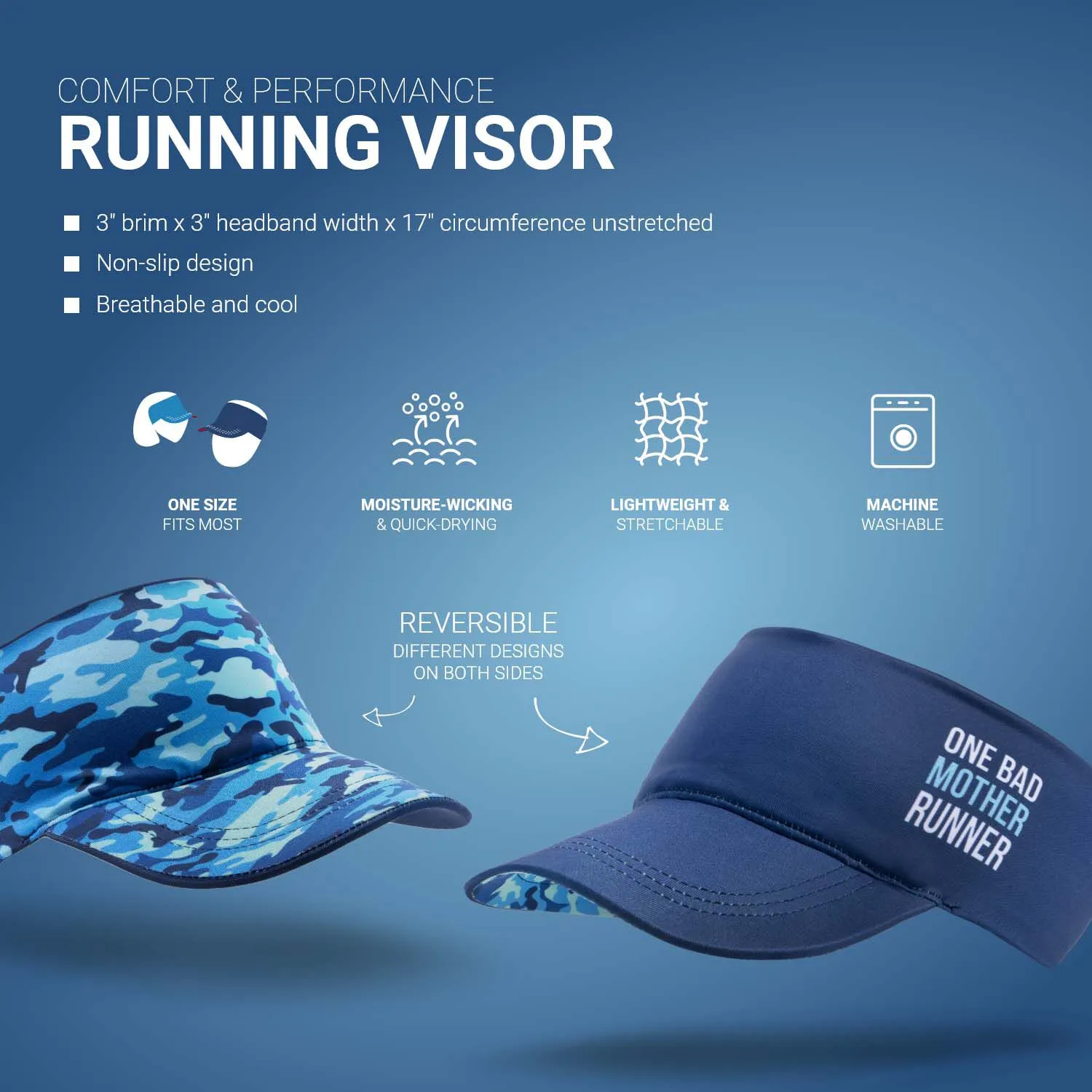 This lightweight visor is designed for all the runner moms. Our performance visor features a wide brim and stretchable band for all-day comfort. The breathable and moisture-wicking material keeps you dry and cool during any activity. These foldable visors are also reversible, offering two unique designs in one! The design on one side features “One Bad Mother Runner” and all-over camo pattern on the other. Keep the sun, hair, and sweat off your face while showing off your mom pride in our comfort performance visor.