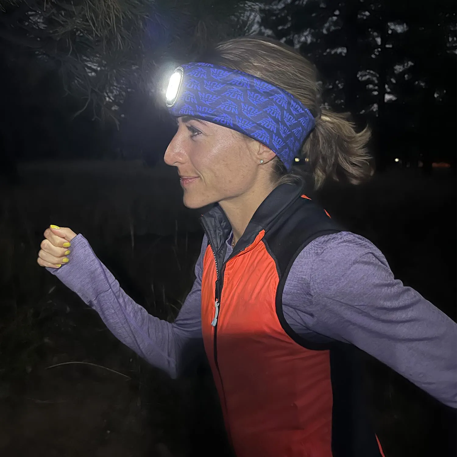 - Moisture-wicking microfiber polyester headband with fleece lining | removable and rechargeable LED light | reversible