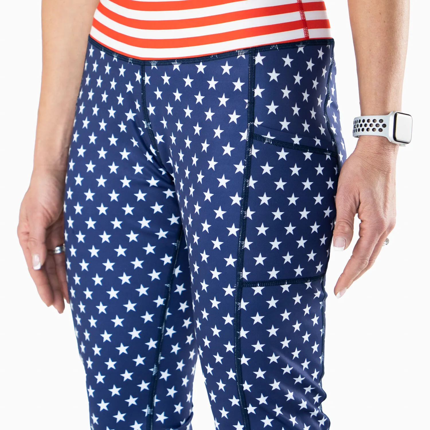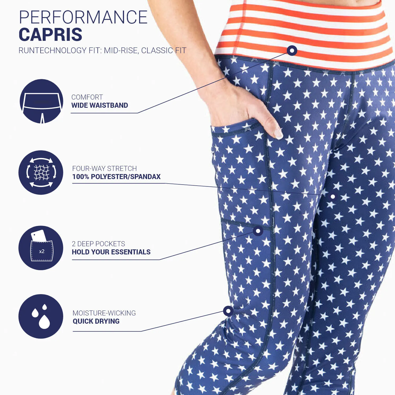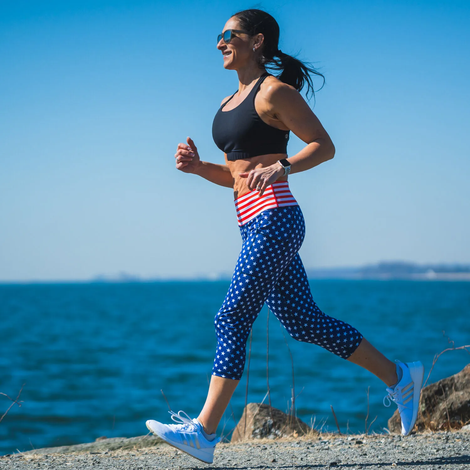 Show off your Patriotic pride in our running capris. Made with RunTechnology® performance fabric, our Run Free capris are designed to provide comfort and performance during your active lifestyle. The fabric is moisture-wicking and has a four-way stretch, making it perfect for any athletic activity. The wide waistband and leg pockets provide convenience and comfort while you move. The Run Free capris are stylish enough to wear outside of the gym. Whether you’re a serious runner or athlete or just someone who enjoys staying active, these capris are a great choice for anyone looking for comfortable and functional activewear.