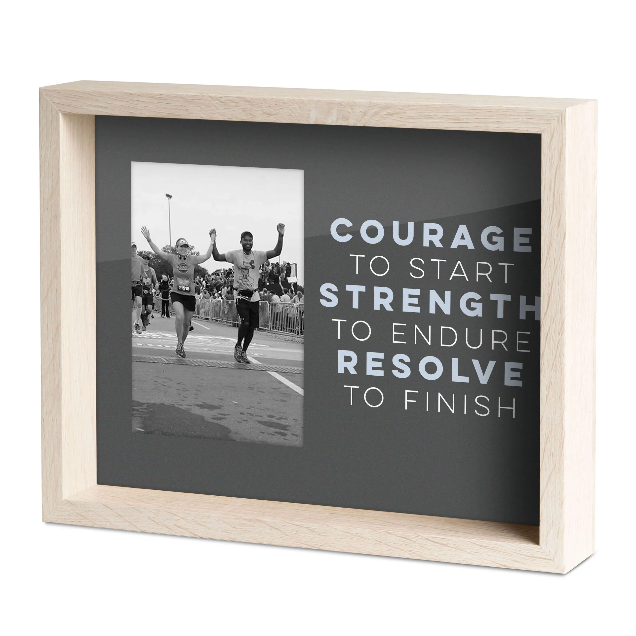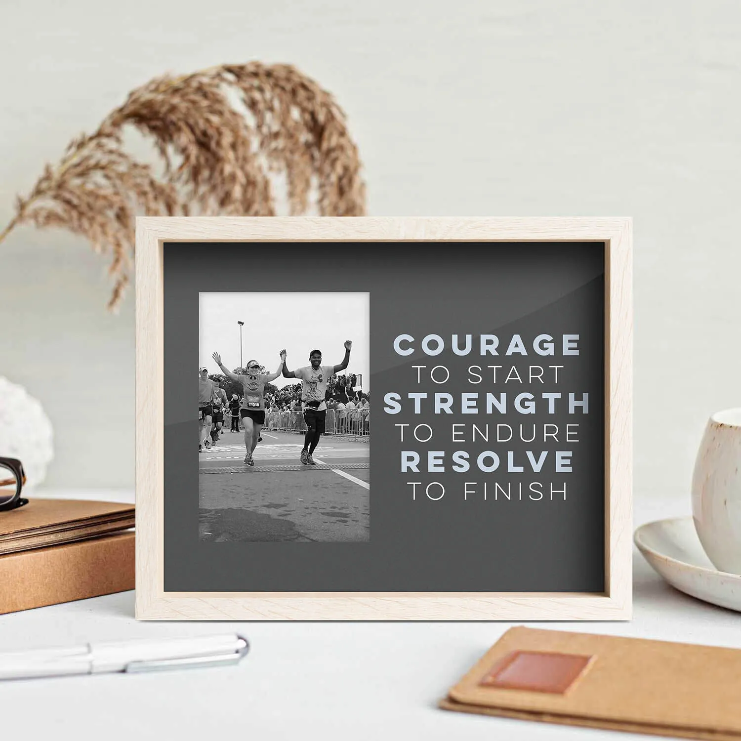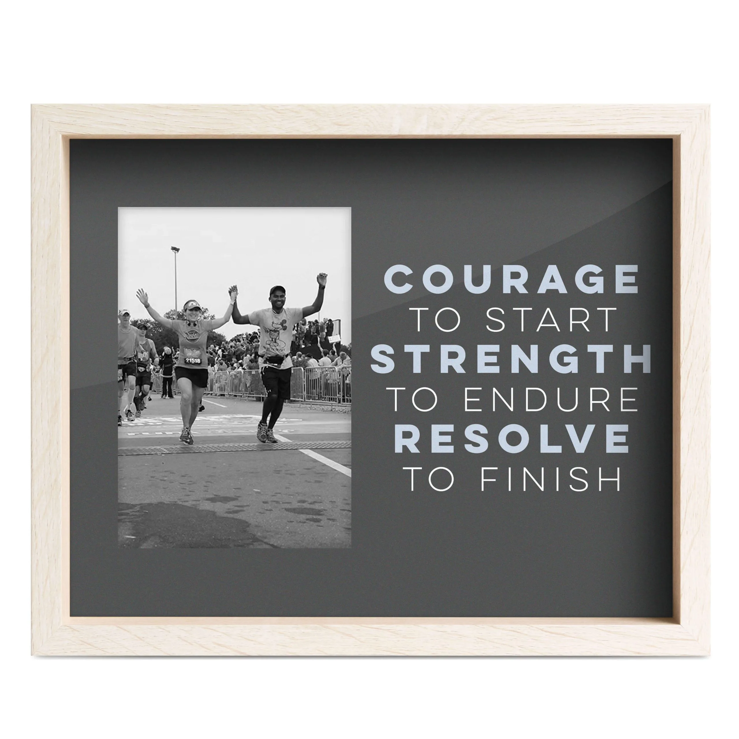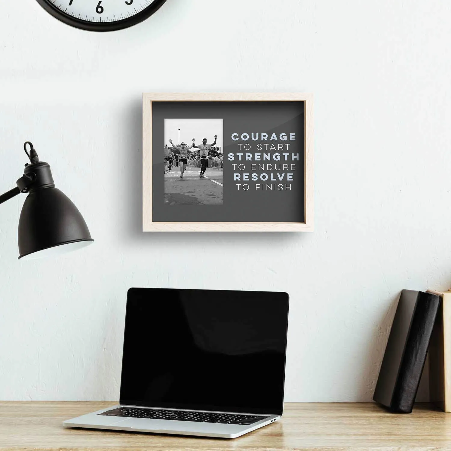 Our Courage To Start Premier Frame features a unique high quality printed design on glass that compliments any photo making it the perfect gift for every occasion. This 10 1/2″ x 8 1/2″ frame can capture that one treasured moment in a vertical 4″ x 6″ photo. Best of all, you can showcase your frame like a shadow box by displaying it on a table or hanging it on a wall. This frame exemplifies all the beauty having a glass cover with a durable wood-like resin texture. Admire your love of running with this one of a kind frame, truly the best gift you can give to the runner in your life.