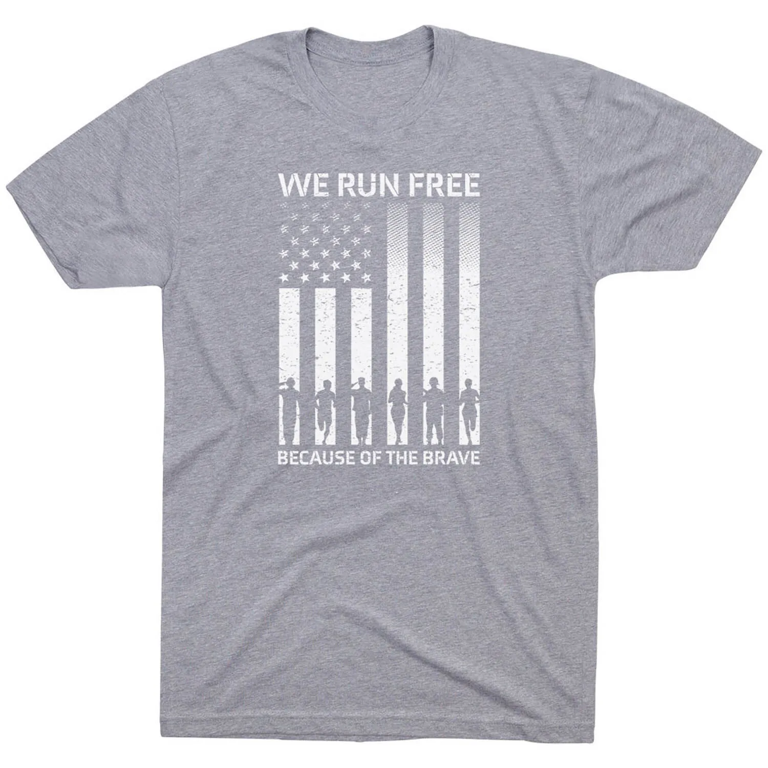 This Because of the Brave t-shirt features a distinctive design that combines patriotism and running. The material is lightweight, soft, and has a slightly heathered texture, ensuring maximum comfort. The tee has a relaxed, unisex fit with a crewneck, making it easy to pair with any athletic or everyday bottoms. It’s a stylish choice for both patriotic races and casual wear, and makes a great gift for any runner. Perfect for any special patriotic occasions like Memorial Day or the 4th of July.