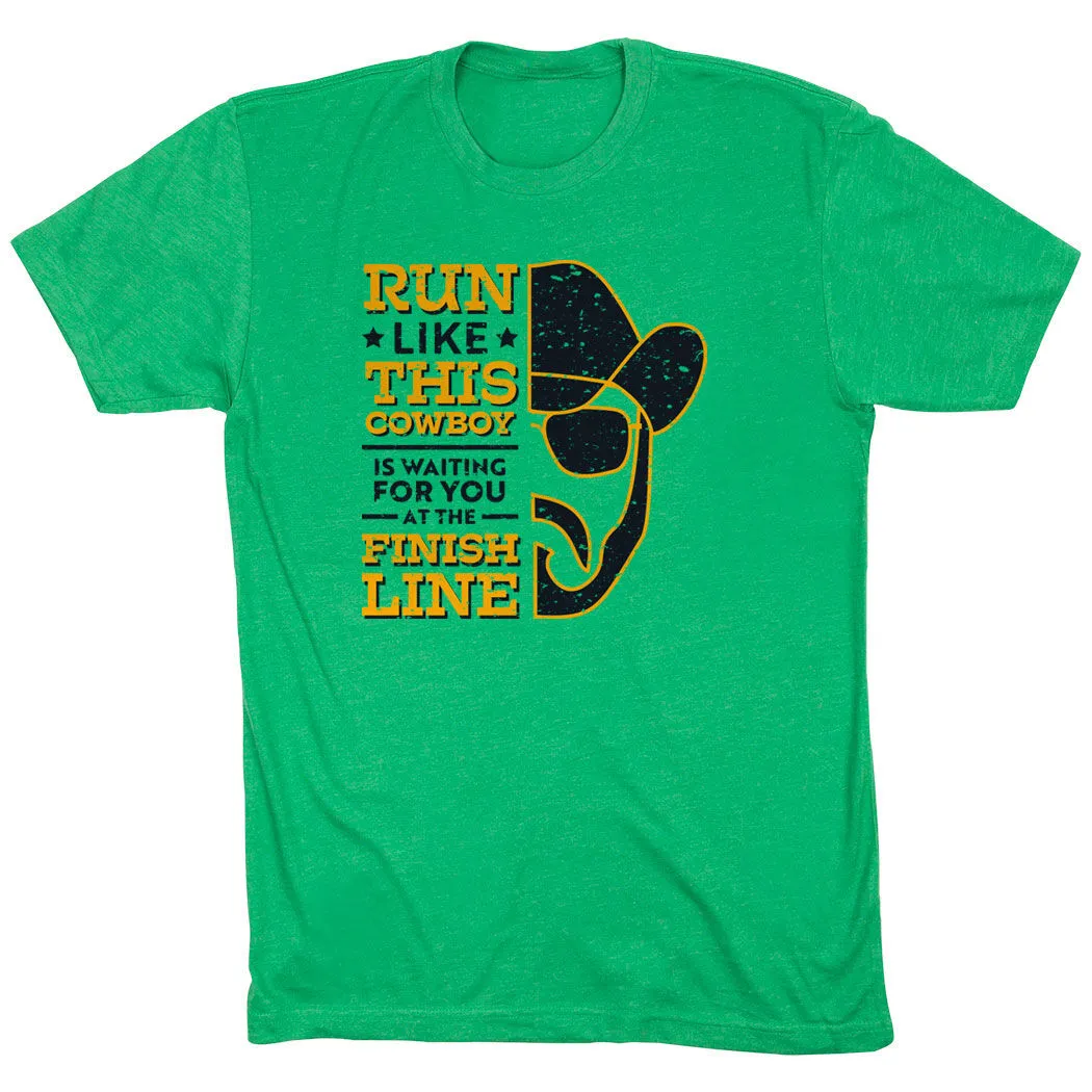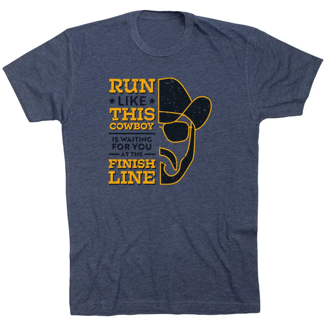 Show off your cowboy pride in our short sleeve tee featuring our exclusive Finish Line Cowboy design. The tee is made from soft, lightweight, and slightly heathered material. Our crewneck short sleeve tee has a relaxed, unisex fit that looks great when paired with any choice of athletic or everyday bottoms. This stylish short sleeve tee is perfect for everyday wear and an ideal running gift for any occasion.