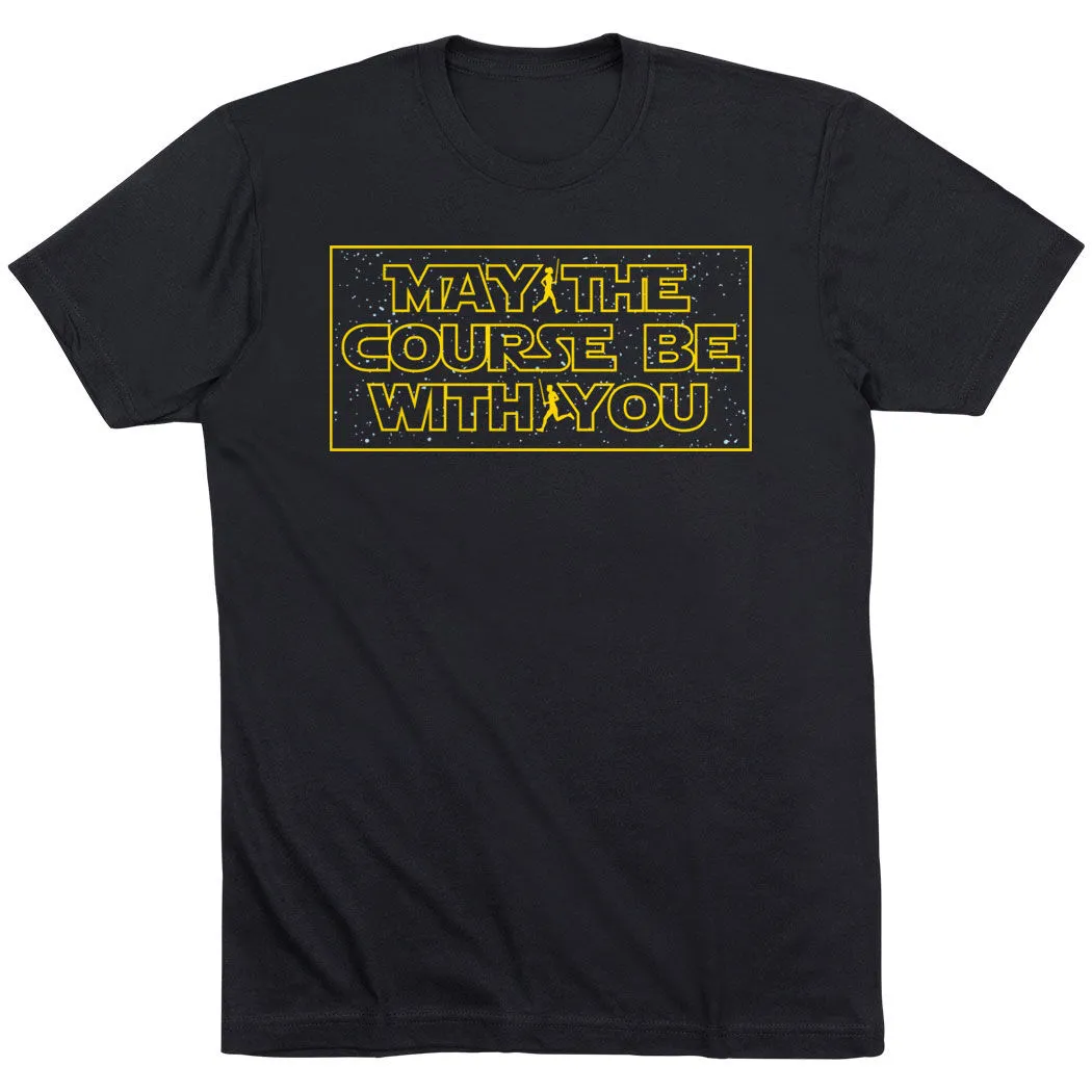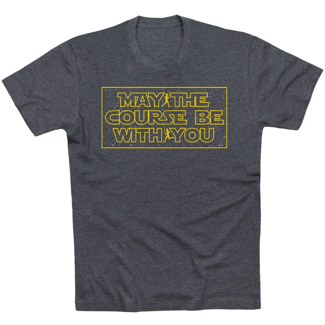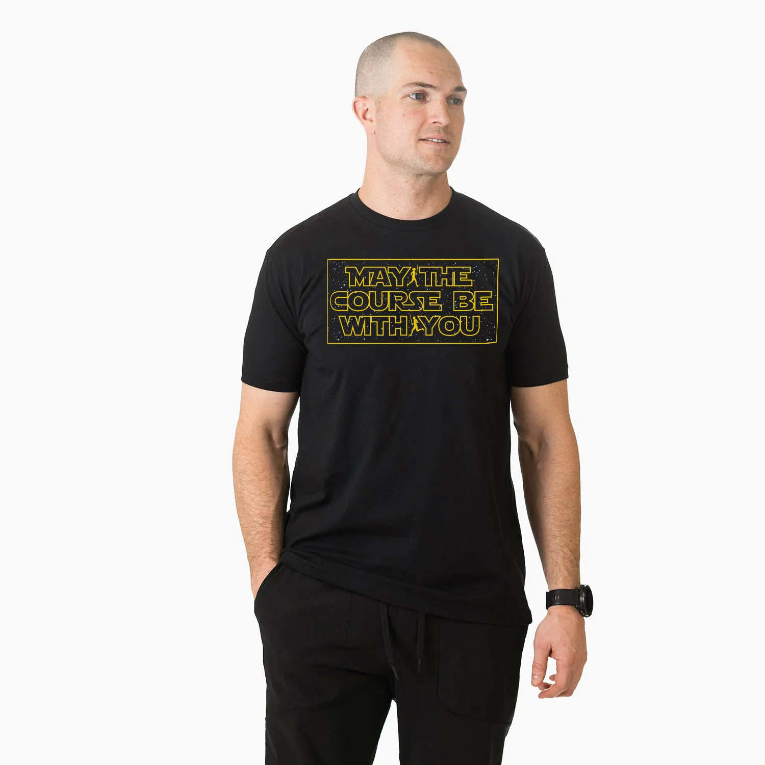 May the Course Be with You in our short sleeve tee featuring an exclusive running design. The tee is made from soft, lightweight, and slightly heathered material. Our crewneck short sleeve tee has a relaxed, unisex fit that looks great when paired with any choice of athletic or everyday bottoms. This stylish short sleeve tee is perfect for magical races, everyday wear, and an ideal running gift for any occasion.
