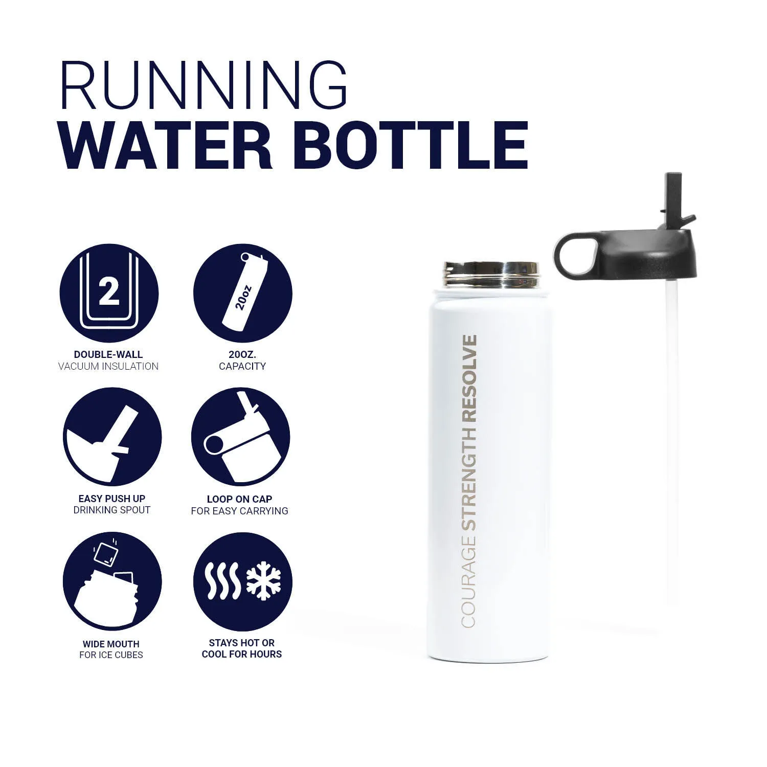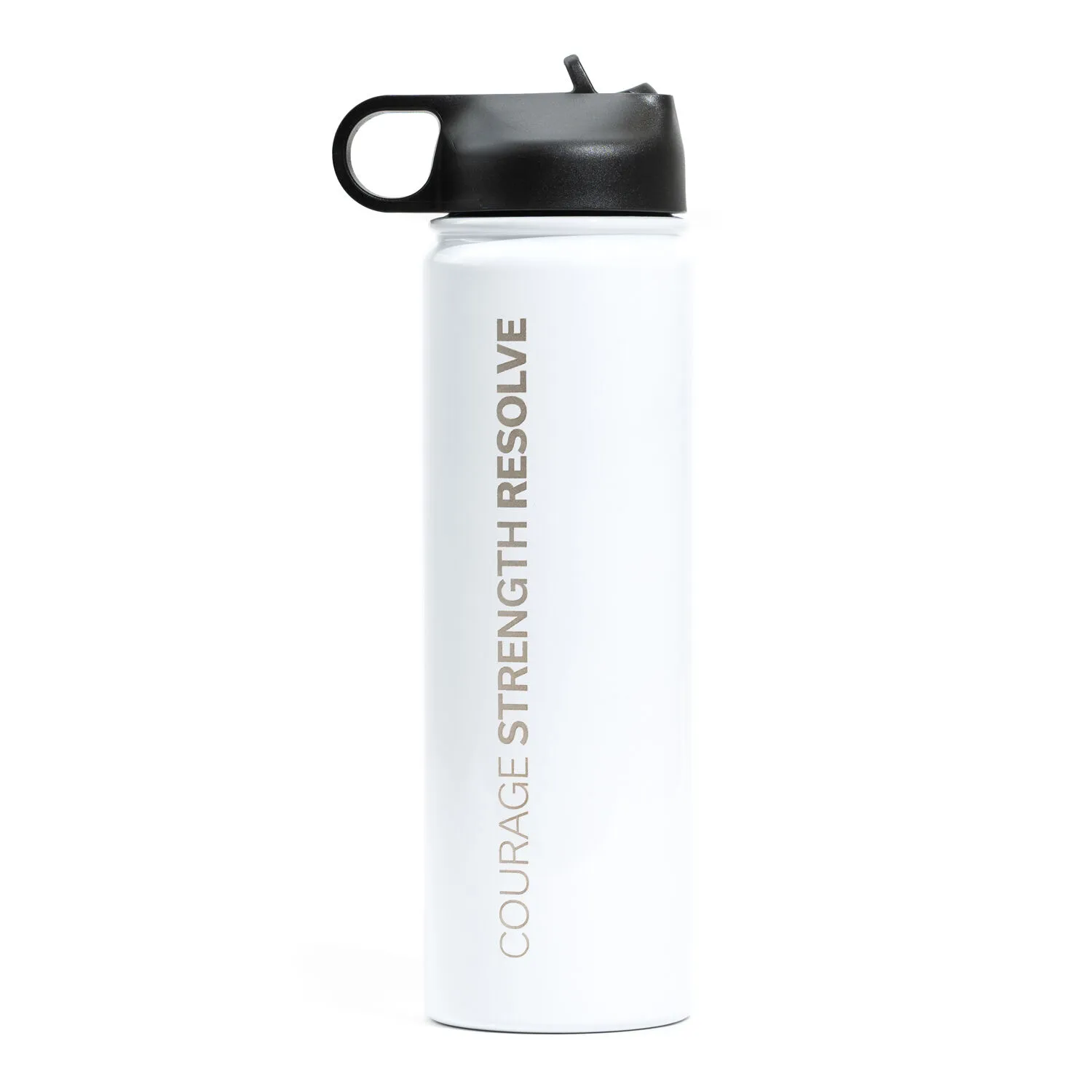 Our RunTechnology® water bottle features one-of-a-kind engraved Courage Strength Resolve design. The 20 oz. double vacuum insulated tumbler is the perfect choice to retain freshness and keep any beverage at its optimal temperature for an extended period of time. Our stainless steel water bottle offers an easy push up drinking spout with straw, wide mouth for ice cubes, as well as a loop on the cap for easy carrying. This unique water bottle with an engraved design makes for a great gift for anyone who is always on-the-go.