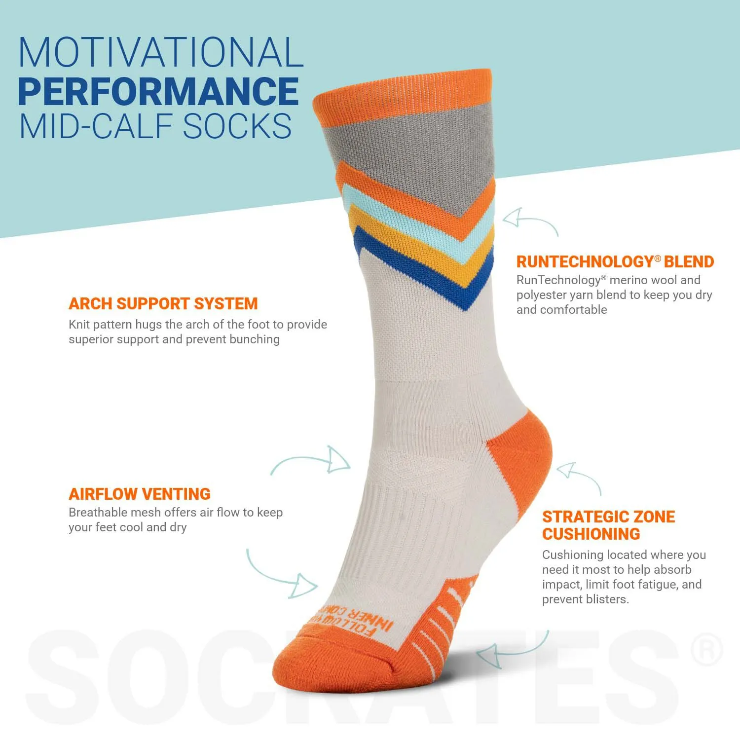 - ULTIMATE COMFORT: These high-quality running Socrates® mid-calf performance socks are designed for ultimate comfort and daily motivation. The socks offer cushioned footbed to help absorb impact, limit foot fatigue, and prevent blisters. These socks are equipped with stay-up technology as well as an arch support system to provide superior support and prevent bunching. Stay dry and cool with the moisture-wicking RunTechnology® material and breathable ventilation zones.