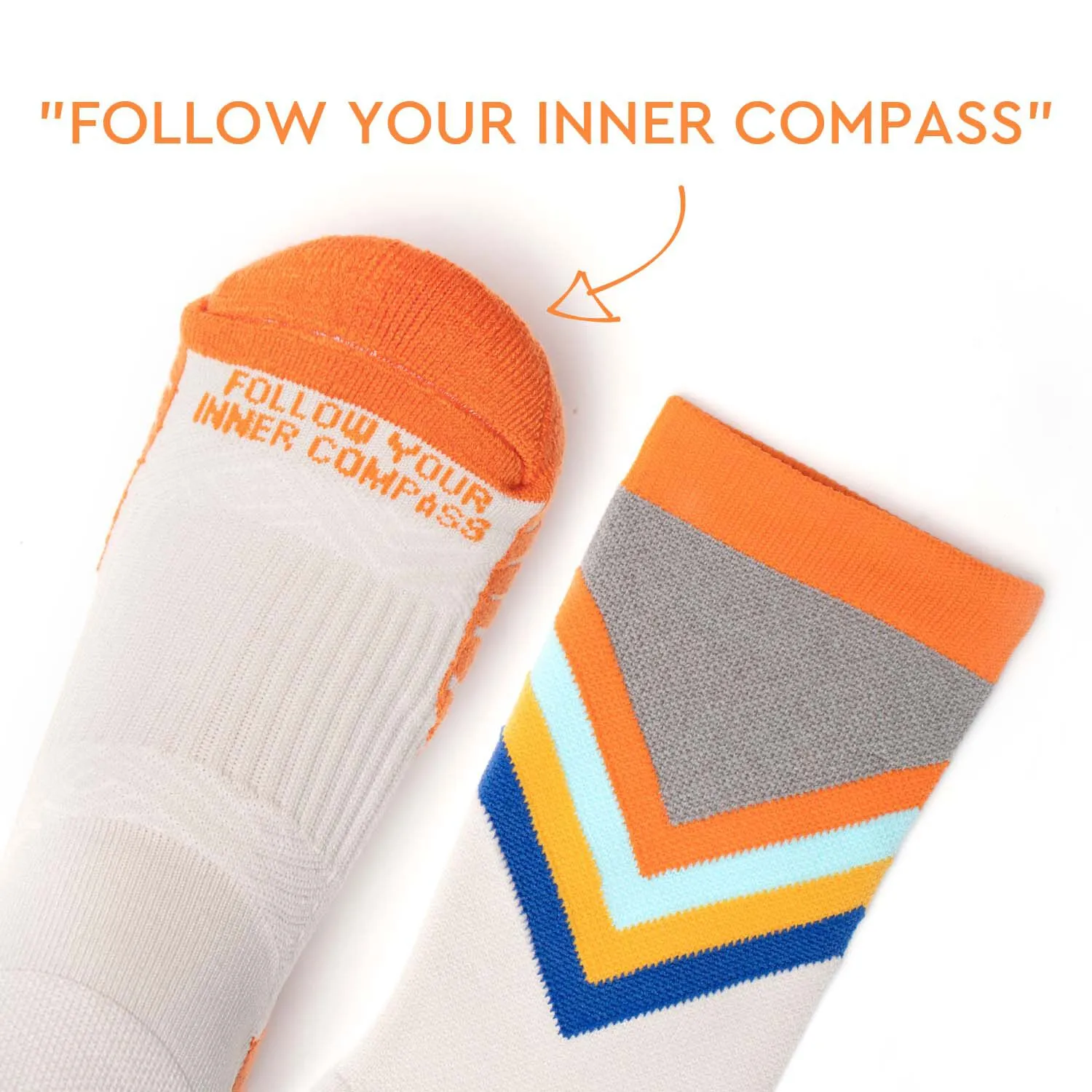 Whether you are preparing or participating in a big race, our Follow Your Inner Compass Socrates® mid-calf performance socks will keep you comfortable and motivated. These moisture-wicking crew socks are sure to keep a runner’s feet comfortable and dry with the RunTechnology® merino wool and polyester yarn blend. The cushioned footbed absorbs impact, limits foot fatigue, and prevents blisters. Its arch support system provides superior support and prevents bunching. The Socrates® mid-calf performance socks also include a motivational message making them a great gift for any occasion.