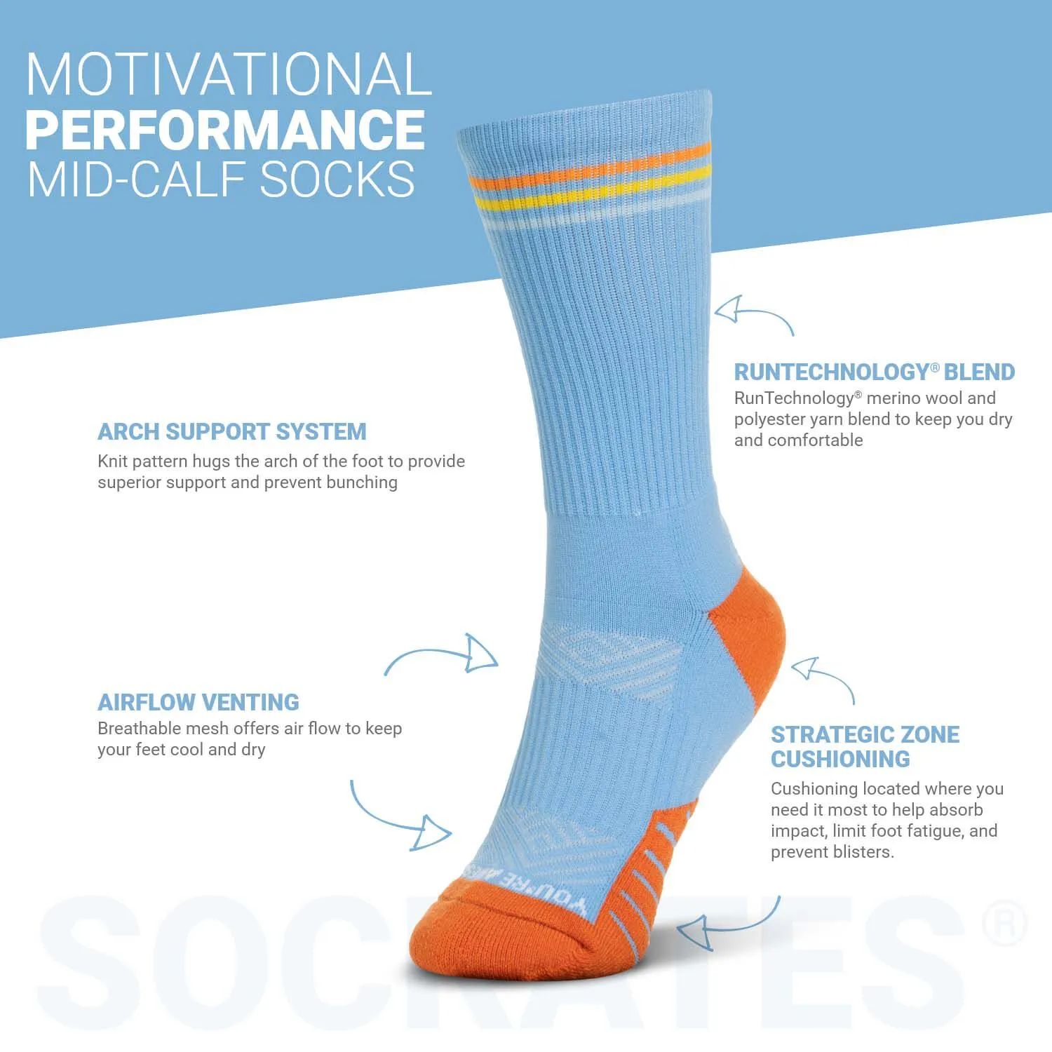 - ULTIMATE COMFORT: These high-quality running Socrates® mid-calf performance socks are designed for ultimate comfort and daily motivation. The socks offer cushioned footbed to help absorb impact, limit foot fatigue, and prevent blisters. These socks are equipped with stay-up technology as well as an arch support system to provide superior support and prevent bunching. Stay dry and cool with the moisture-wicking RunTechnology® material and breathable ventilation zones.