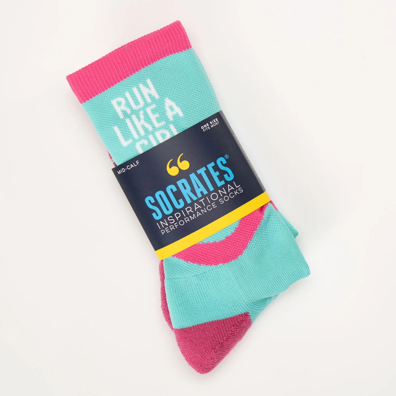 Whether you are preparing or participating in a big race, our Run Like a Girl Socrates® mid-calf performance socks will keep you comfortable and motivated. These moisture-wicking crew socks are sure to keep a runner’s feet comfortable and dry with the RunTechnology® merino wool and polyester yarn blend. The cushioned footbed absorbs impact, limits foot fatigue, and prevents blisters. Its arch support system provides superior support and prevents bunching. The Socrates® mid-calf performance socks also include a motivational message making them a great gift for any occasion.