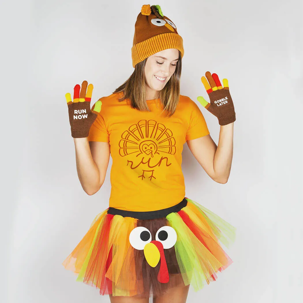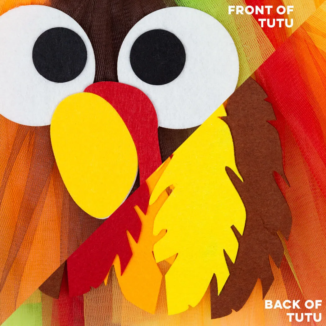 Get ready for all those fun Thanksgiving races with our colorful Turkey Trot tutu, you will be sure to stand out from crowd in this festive tutu. Our colorful Turkey Trot tutu has a goofy felt turkey face and tail feathers to make the tutu extra festive. With two layers of tulle and an elastic waistband this is a great tutu to wear over your favorite running pants, capris or shorts.