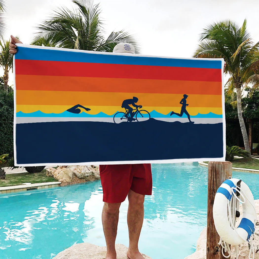 Any triathlete will love to show off that triathlon pride and accomplishments at the pool or beach with one of our super absorbent premium towels. This densely thick woven premium towel is luxuriously soft and absorbent, which makes it the perfect towel for home, beach, or pool. The 60″ X 30″ plush towel can also easily double as a beach and pool blanket.
