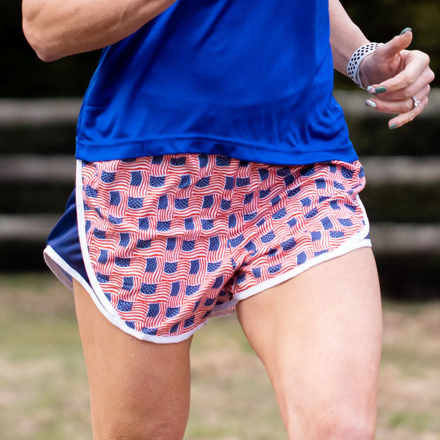 The lightweight TrueRun shorts for women feature an exclusive USA Patriotic design perfect for your runs and errands. The moisture-wicking RunTechnology® performance polyester fabric keeps you dry and cool. With the mesh side insets and lightweight liner, our athletic shorts deliver comfort and enhanced mobility. The elastic waistband and adjustable internal drawstring offer a personalized fit. The TrueRun shorts are also equipped with an internal drop-in back pocket to hold your essentials. These stylish shorts will quickly become your go-to pair for any and all activities.