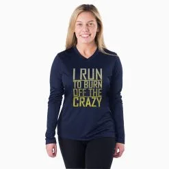 Women’s Long Sleeve Tech Tee – I Run To Burn Off The Crazy (White)