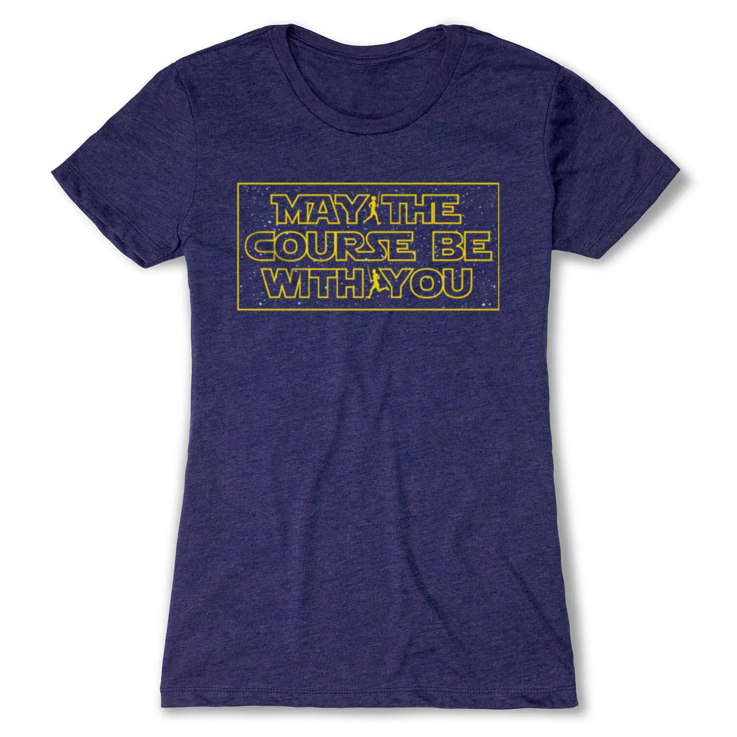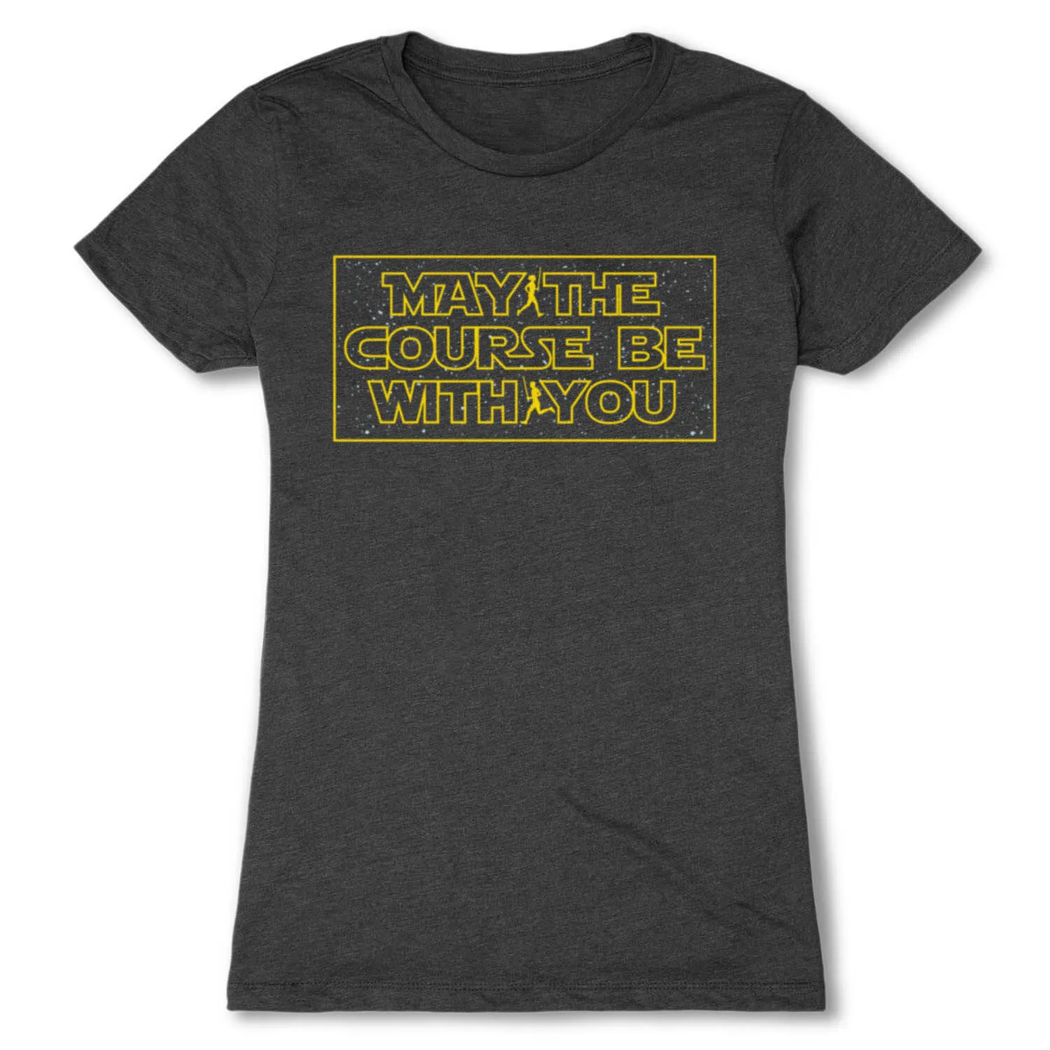 May the Course Be with You in our short sleeve tee featuring an exclusive running design. The slim-fitting tee is made from soft, lightweight, and slightly heathered material. Our everyday tee looks great when paired with any choice of bottoms from leggings and jeans to shorts. This stylish short sleeve tee is perfect for magical races, everyday wear, and an ideal running gift for any occasion.