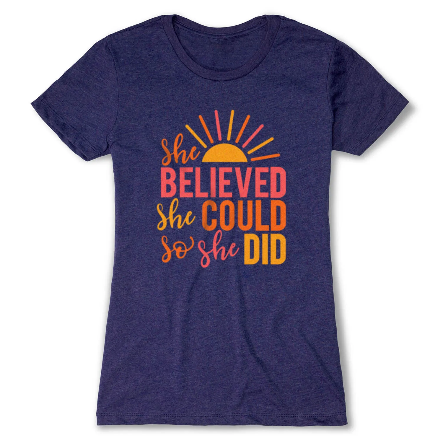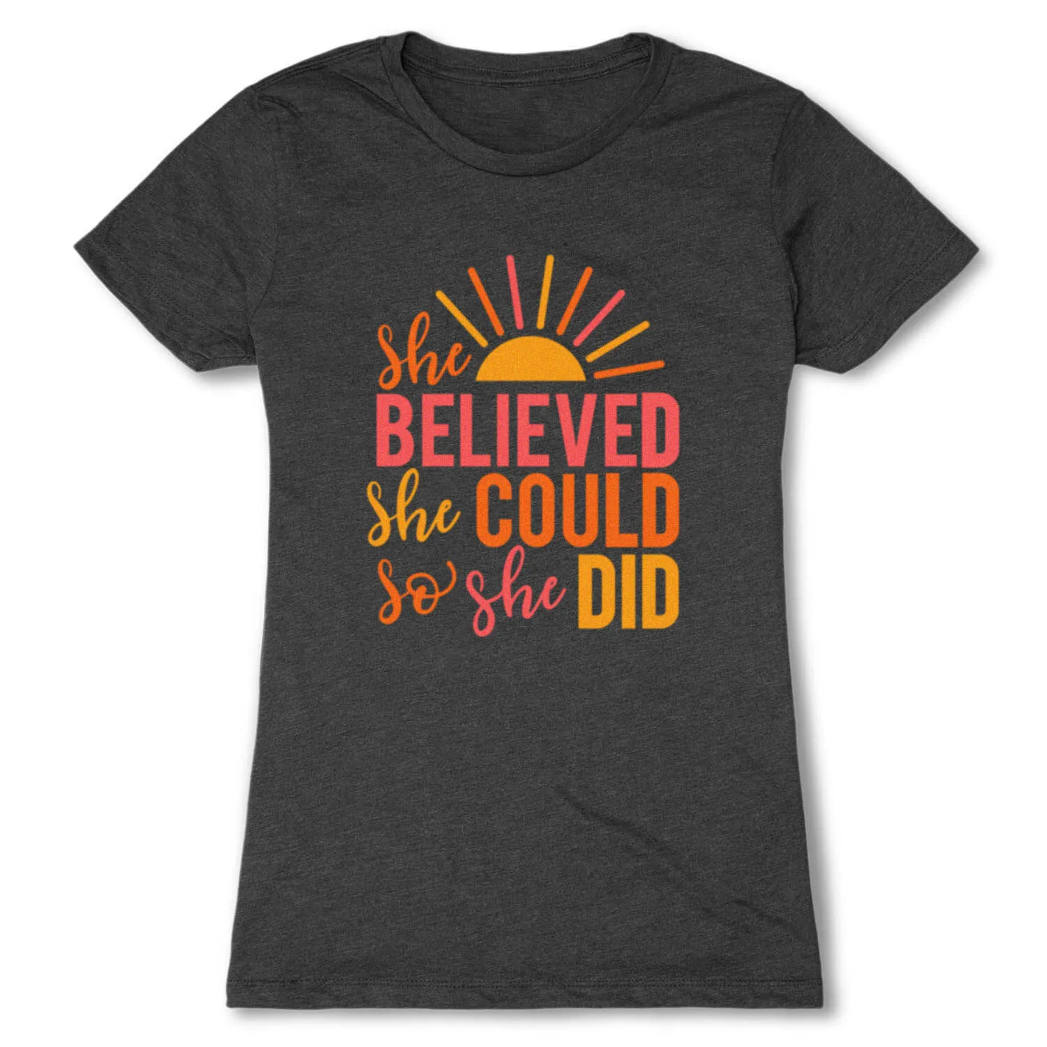 This slim-fitting tee features a motivational She Believed She Could So She Did message. Made from a soft, lightweight and slightly heathered material, this everyday tee is versatile, perfect for both everyday activites and workouts. It makes an ideal inspirational gift for any runner girl.