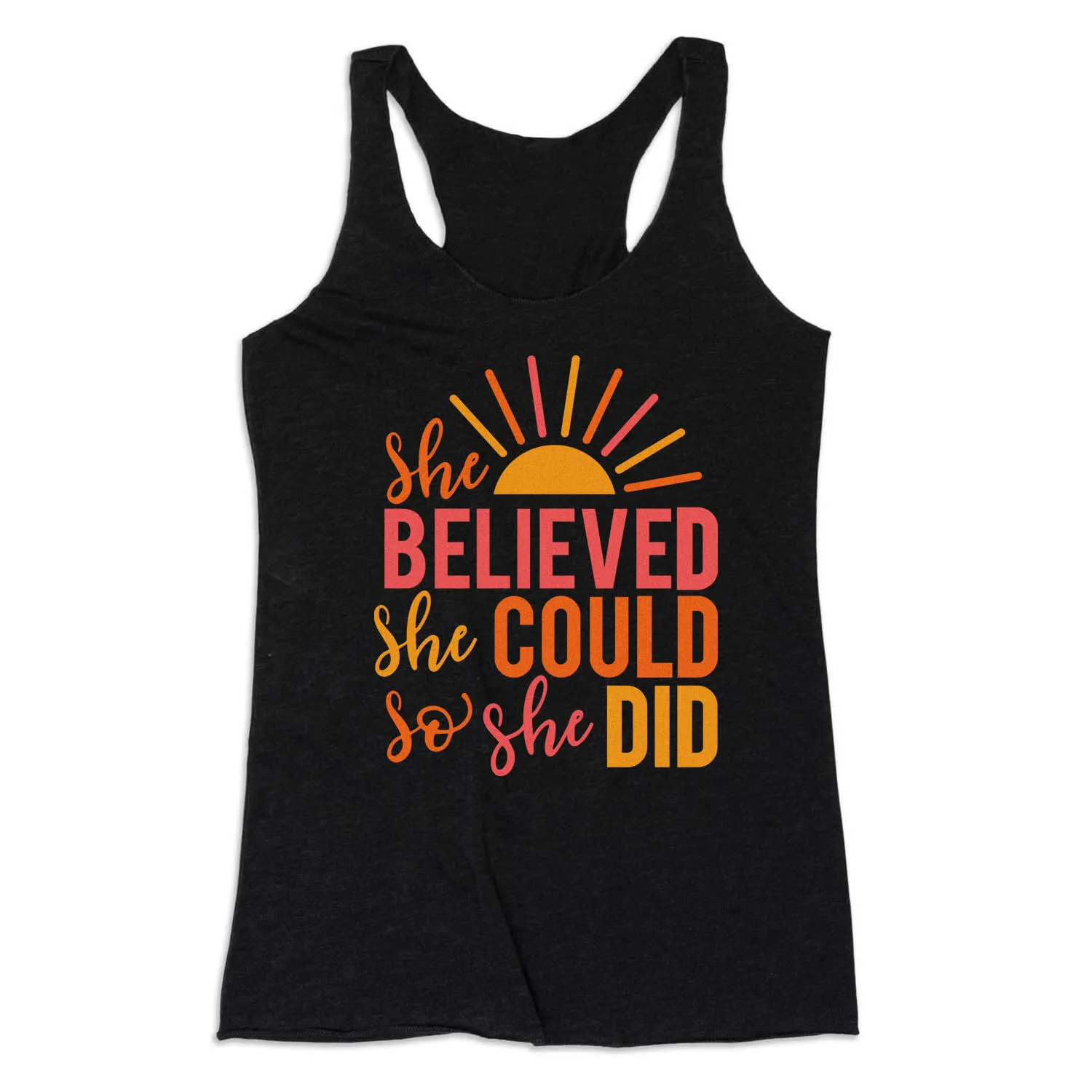 Elevate your athletic spirit with this empowering She Believed She Could So She Did design featured on our everyday tank top. Made from a soft, breathable, and lightweight material, this tank ensures comfort during spring and summer activities, or as a layered outfit during colder seasons. With its versatile and stylish appeal, its a perfect choice for both everyday wear and workouts. It makes for an inspirating and motivational gift idea for any female athlete.