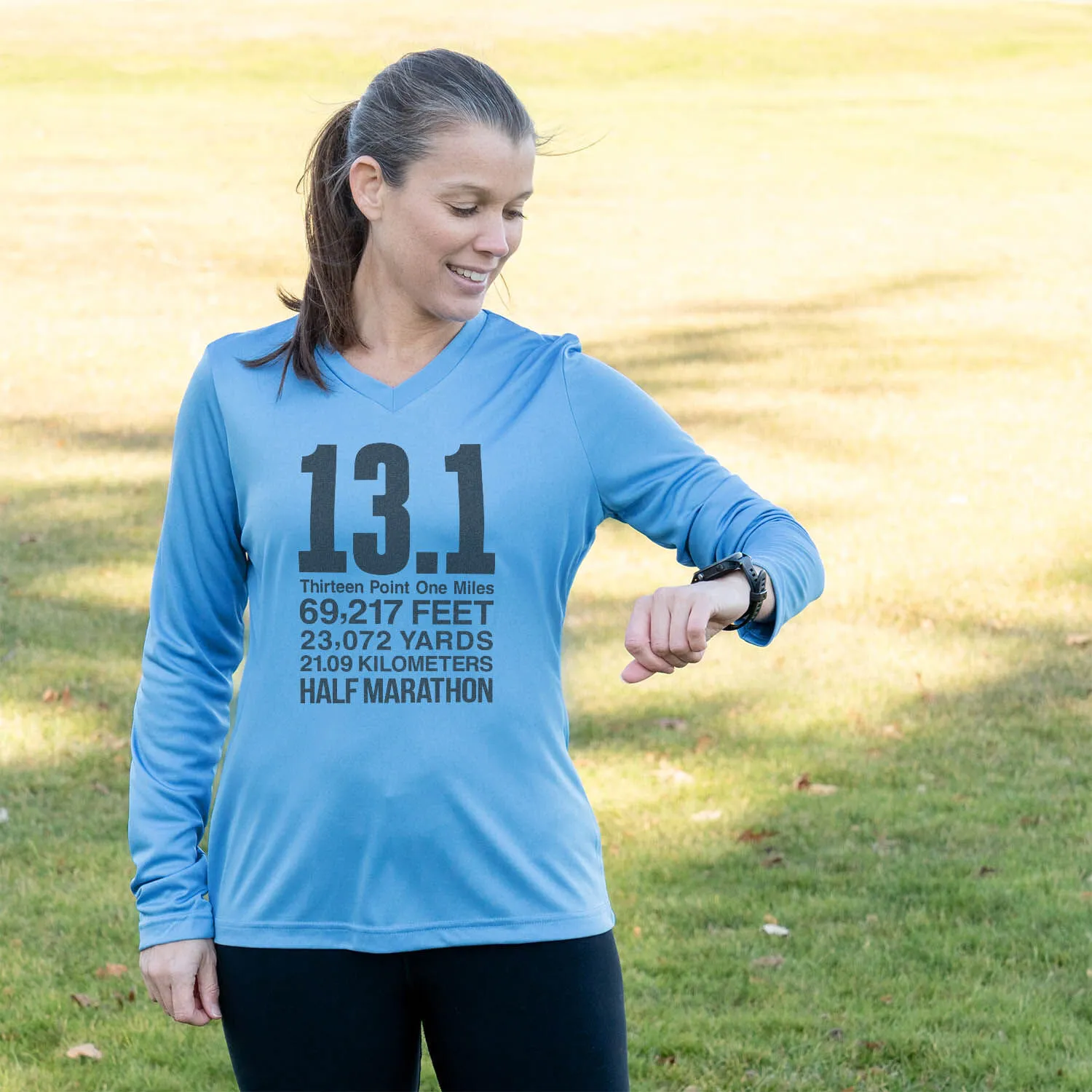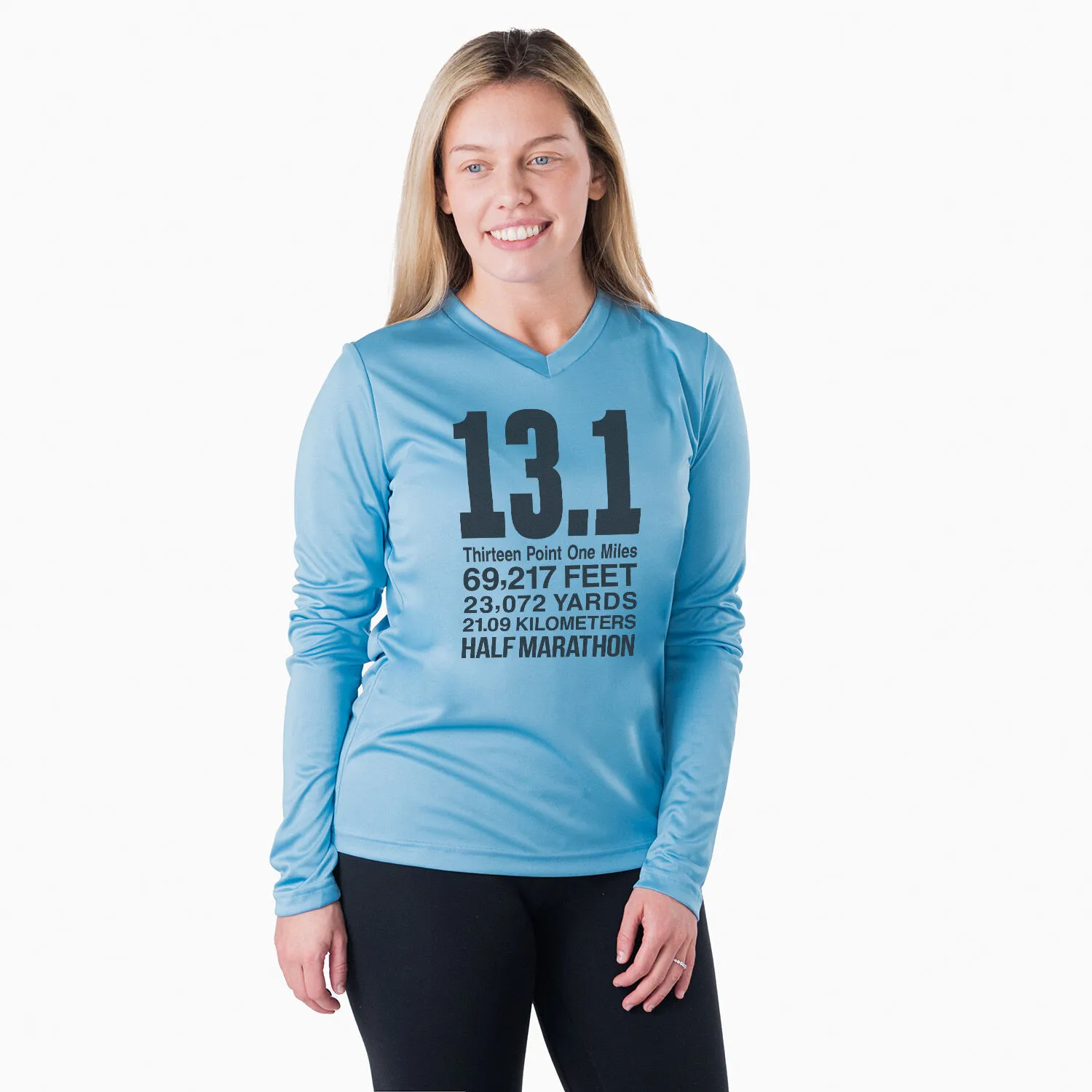 Show off your running pride in our women’s long sleeve tech tee featuring a one-of-a-kind bold design inspired by running. Our V-neck performance tee is made from 100% polyester interlock to keep runners dry and cool. The long sleeve tech tee offers a comfortable and relaxed fit that looks great with any choice of bottoms from leggings and athletic tights to jeans and longs. This stylish tech tee is perfect for everyday wear and an ideal running gift for any occasion.