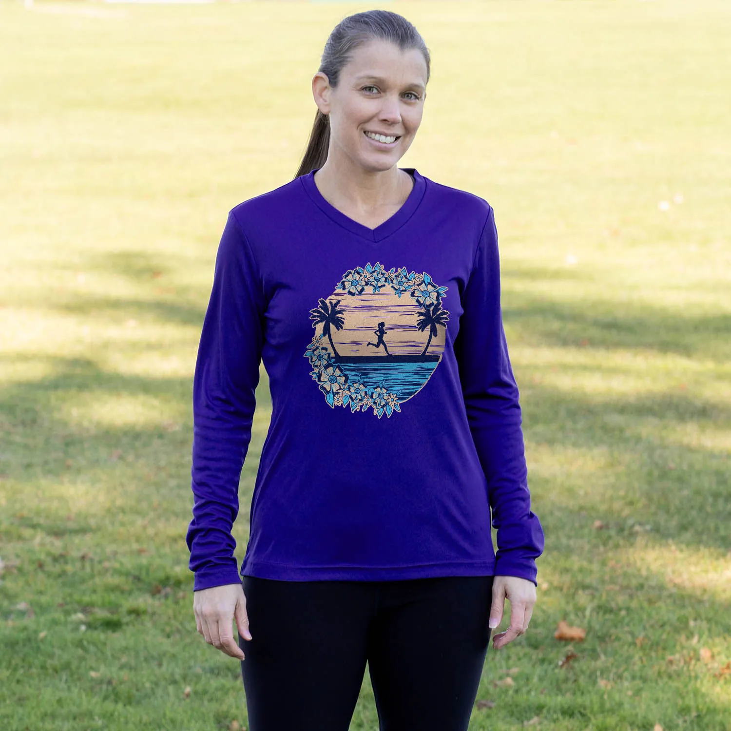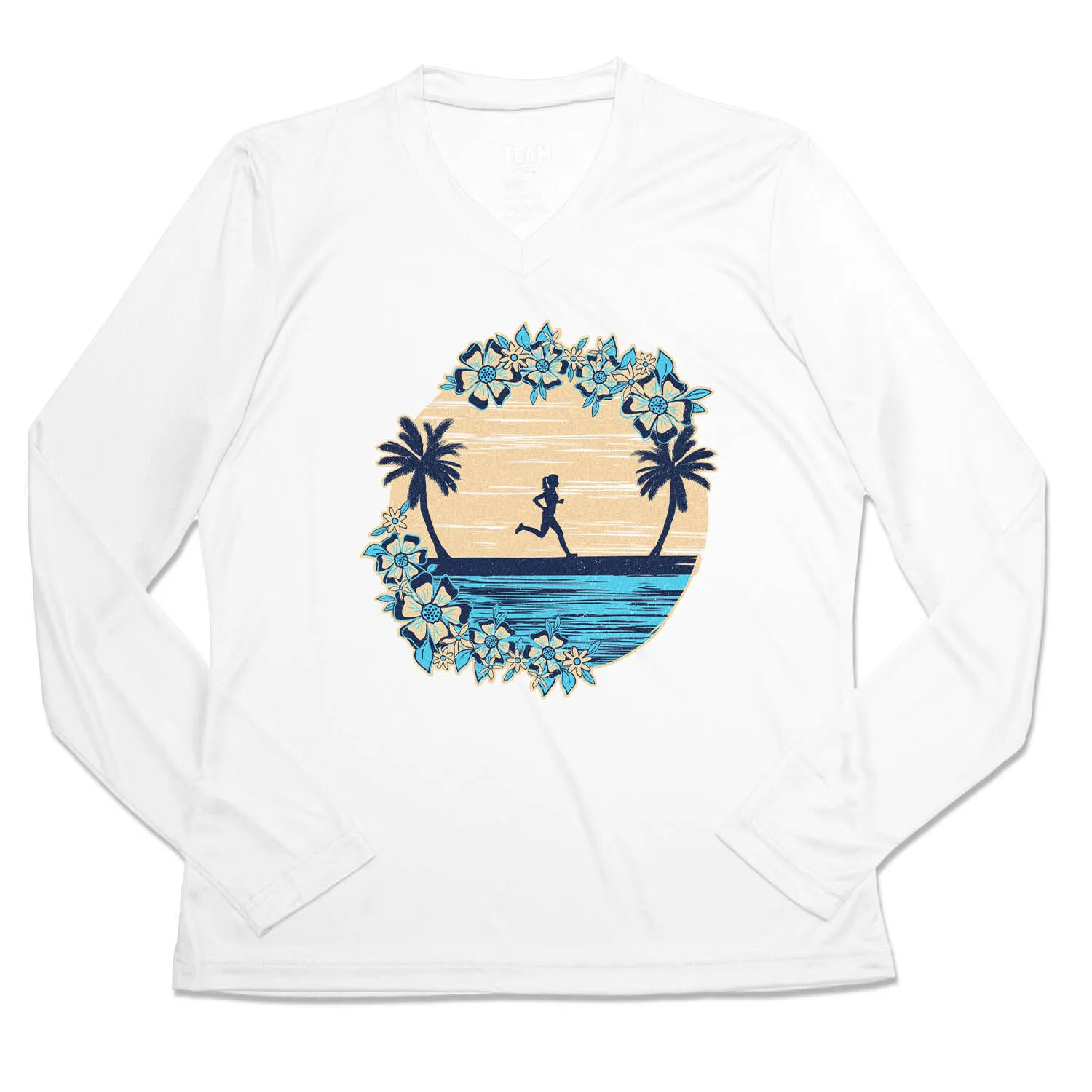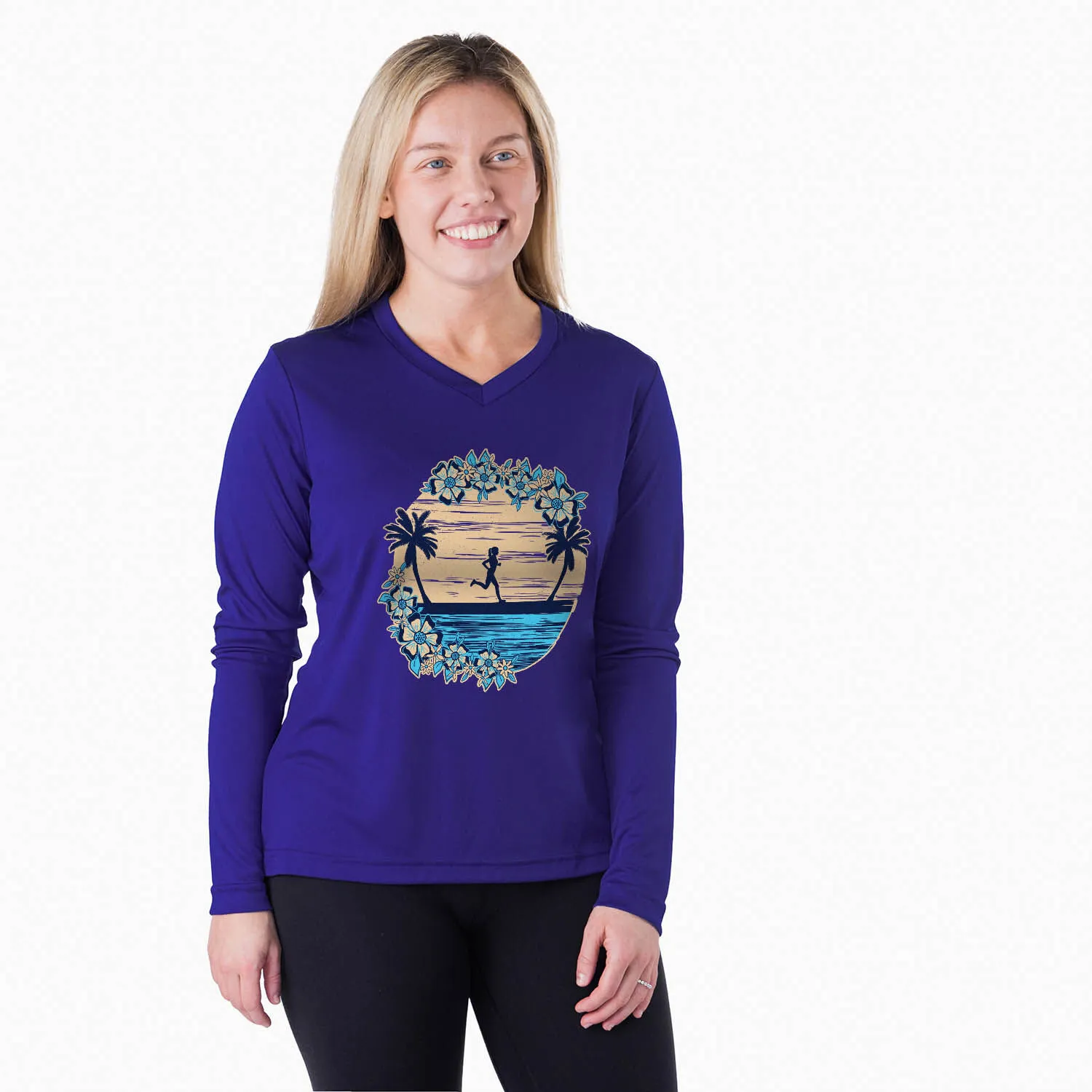 Show off your runner girl pride in our women’s long sleeve tech tee featuring a one-of-a-kind Beach Runner Girl design. Our V-neck performance tee is made from 100% polyester interlock to keep runners dry and cool. The long sleeve tech tee offers a comfortable and relaxed fit that looks great with any choice of bottoms from leggings and athletic tights to jeans and longs. This stylish tech tee is perfect for everyday wear and an ideal running gift for any occasion. Enjoy your beach runs in the most comfortable athletic long sleeve tee for runners.