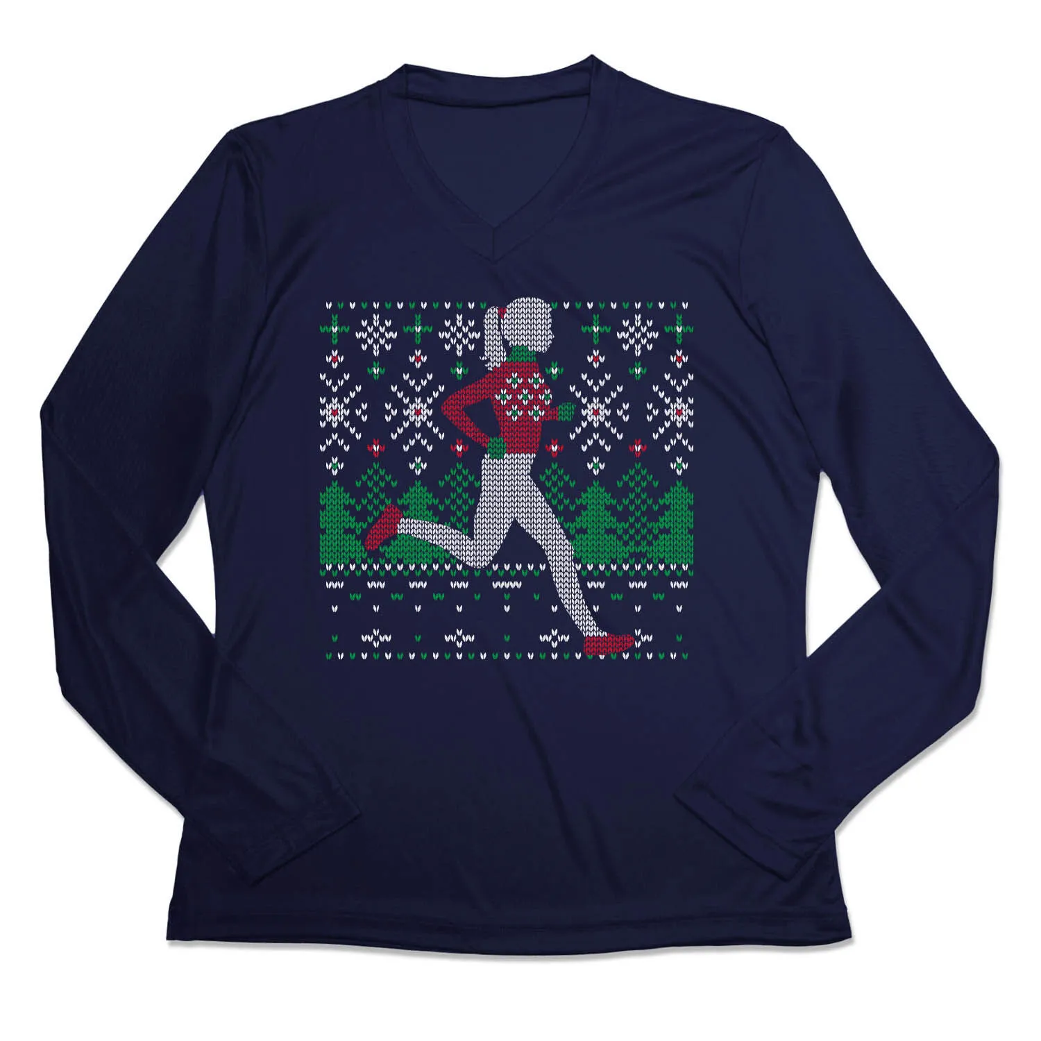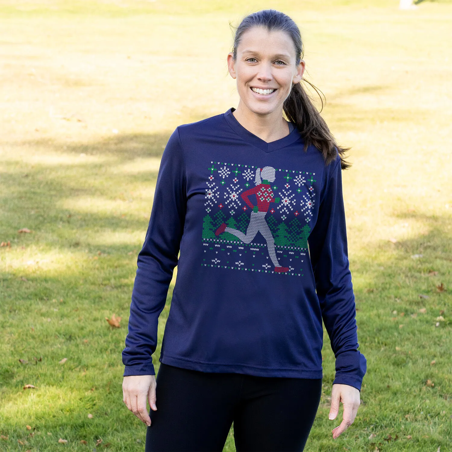 Get in the holiday spirit in our women’s long sleeve tech tee featuring a one-of-a-kind Christmas design inspired by running. Our V-neck performance tee is made from 100% polyester interlock to keep runners dry and cool. The long sleeve tech tee offers a comfortable and relaxed fit that looks great with any choice of bottoms from leggings and athletic tights to jeans and longs. This stylish tech tee is perfect for everyday wear and an ideal running gift for any occasion. Any runner would love this for any holiday race.