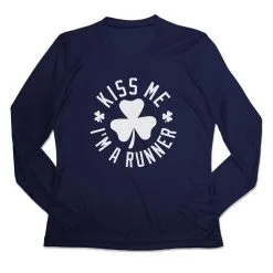 Women’s Long Sleeve Tech Tee – Kiss Me I Am A Runner Shamrock