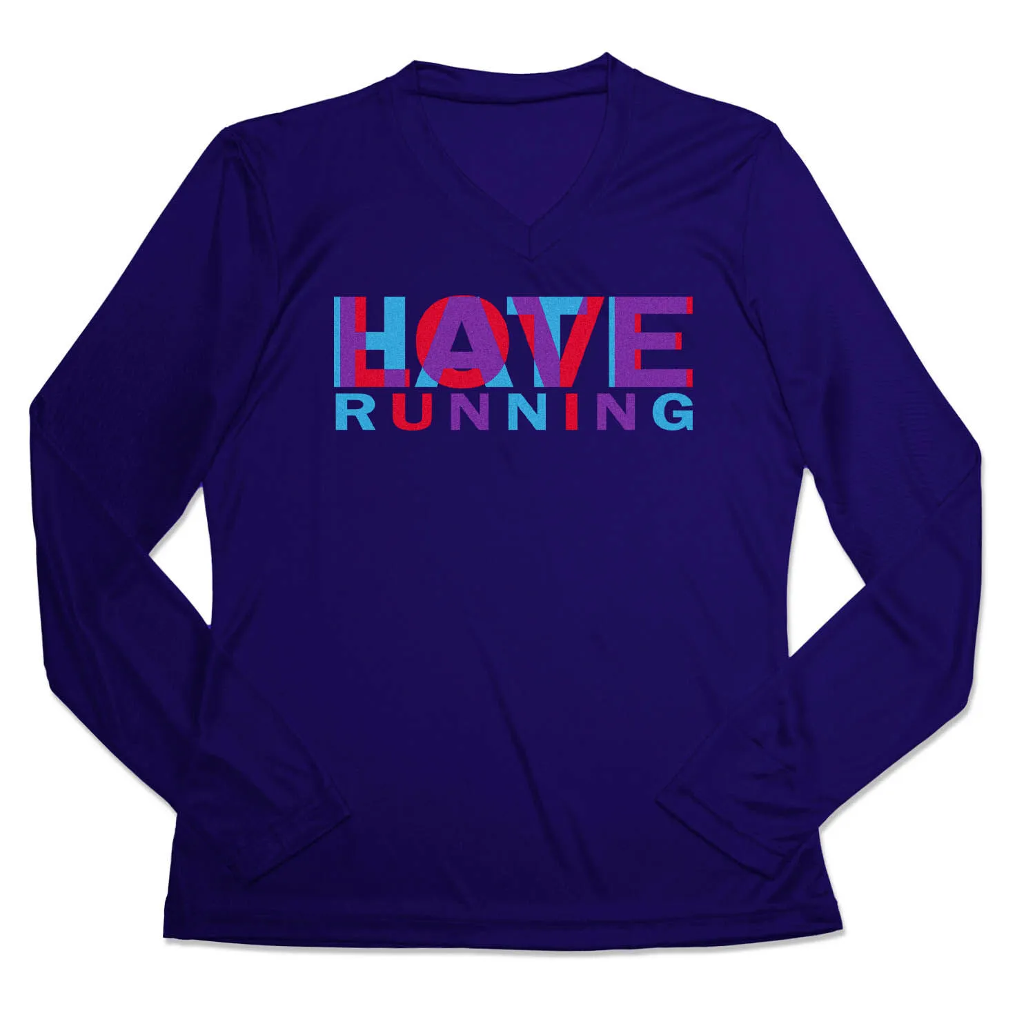 Show off your running pride in our women’s long sleeve tech tee featuring a one-of-a-kind bold design inspired by running. Our V-neck performance tee is made from 100% polyester interlock to keep runners dry and cool. The long sleeve tech tee offers a comfortable and relaxed fit that looks great with any choice of bottoms from leggings and athletic tights to jeans and longs. This stylish tech tee is perfect for everyday wear and an ideal running gift for any occasion.