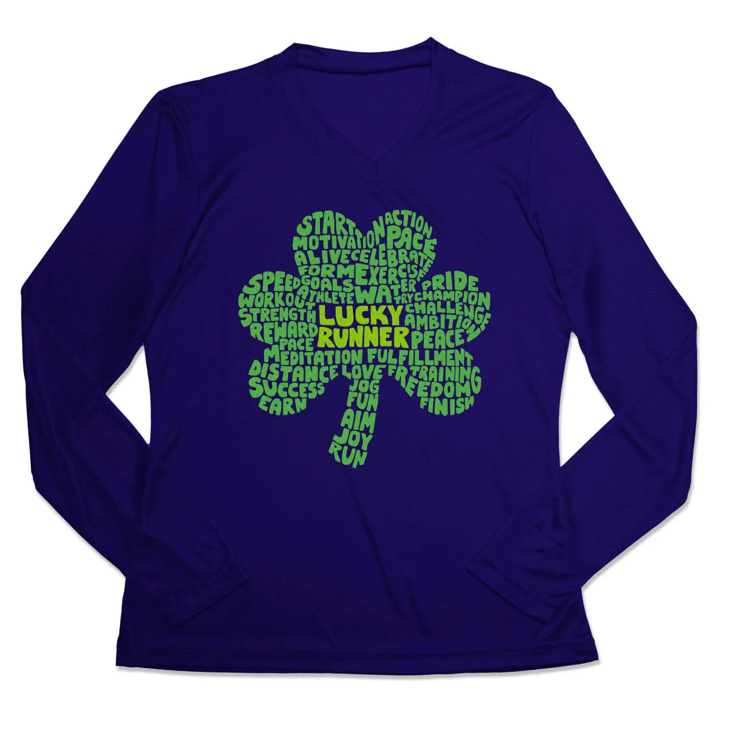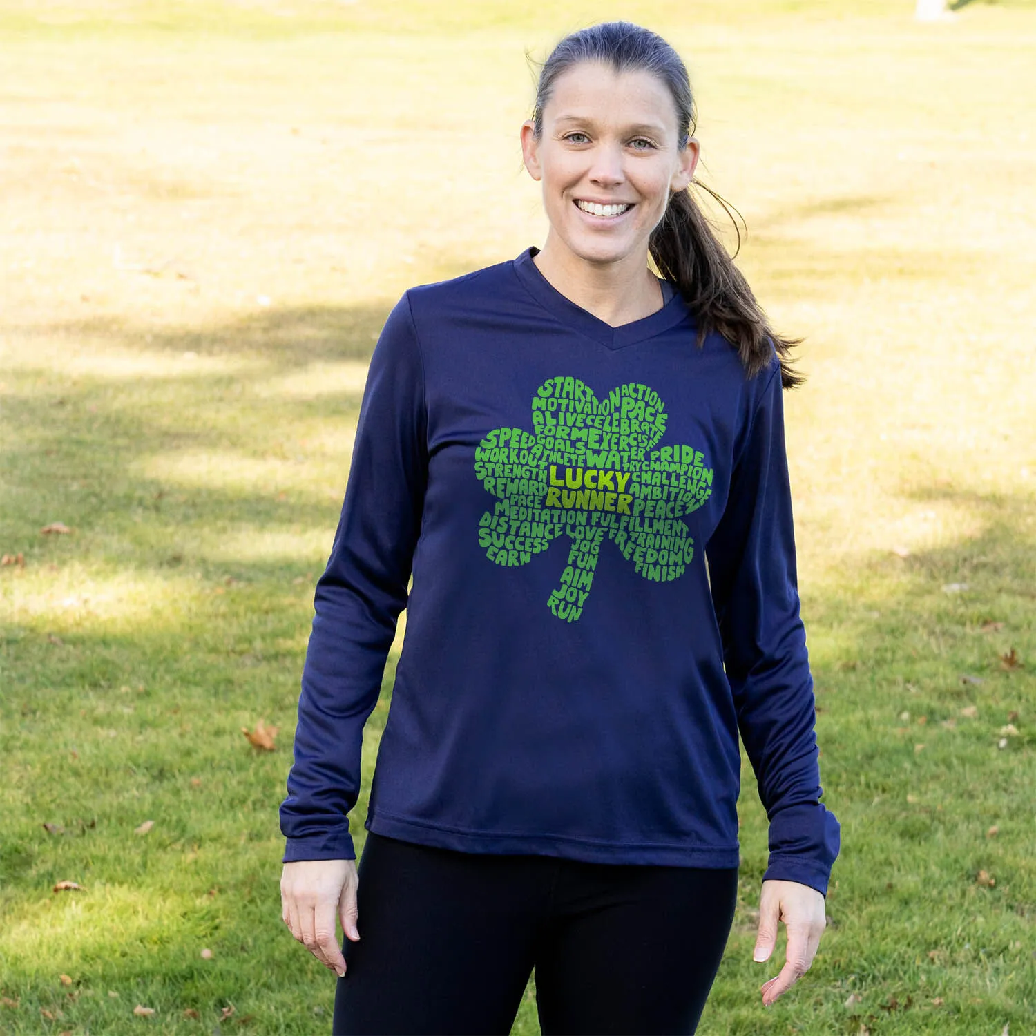 Celebrate St. Patrick’s Day in our women’s long sleeve tech tee featuring our exclusive Lucky Runner design. Our V-neck performance tee is made from 100% polyester interlock to keep runners dry and cool. The long sleeve tech tee offers a comfortable and relaxed fit that looks great with any choice of bottoms from leggings and athletic tights to jeans and longs. This stylish tech tee is perfect for St. Paddy’s festivities, everyday wear, and an ideal running gift for any occasion.